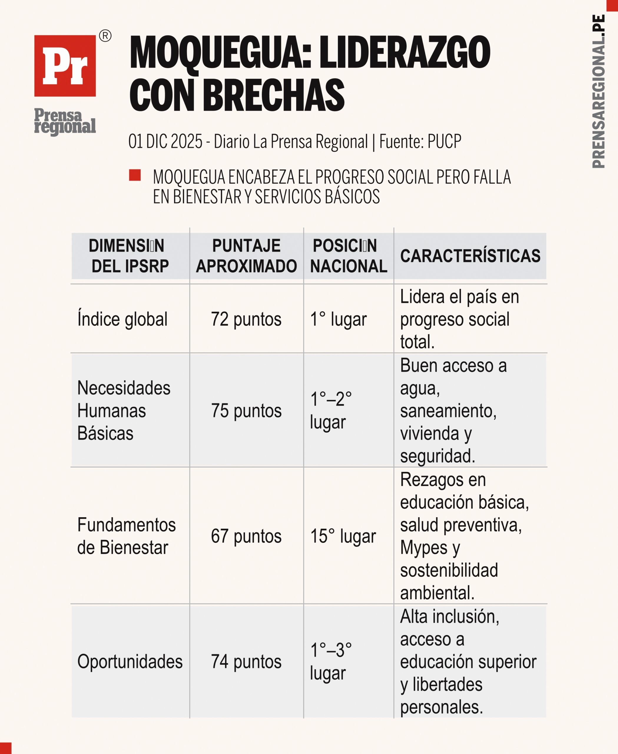 El reciente Índice de Progreso Social Regional del Perú 2025 (IPSRP) de la PUCP ha colocado a Moquegua en el primer lugar nacional, confirmando su liderazgo en infraestructura básica, acceso a servicios y oportunidades de desarrollo. Este resultado es motivo de orgullo en el aniversario de la ciudad, pues refleja avances en necesidades humanas básicas y en la generación de oportunidades ligadas a la renta minera y a la inversión pública. Sin embargo, el mismo estudio revela una paradoja: en la dimensión de Fundamentos de Bienestar, Moquegua se ubica en el puesto 15 de 27 regiones, es decir, en la parte media de la tabla. Este contraste abre un debate sobre la verdadera calidad del progreso regional y la urgencia de cerrar brechas sociales que aún persisten.