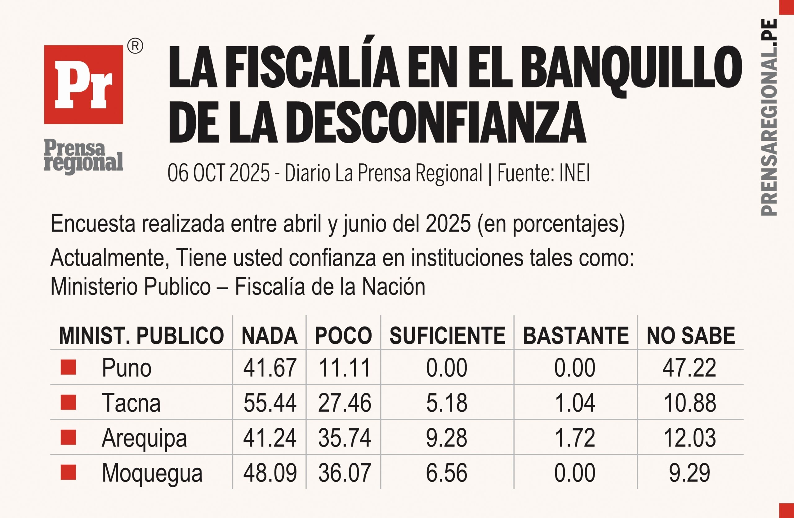 Los resultados del Instituto Nacional de Estadística e Informática (INEI) muestran que la confianza ciudadana en el Ministerio Público – Fiscalía de la Nación atraviesa una profunda crisis en las regiones del sur.