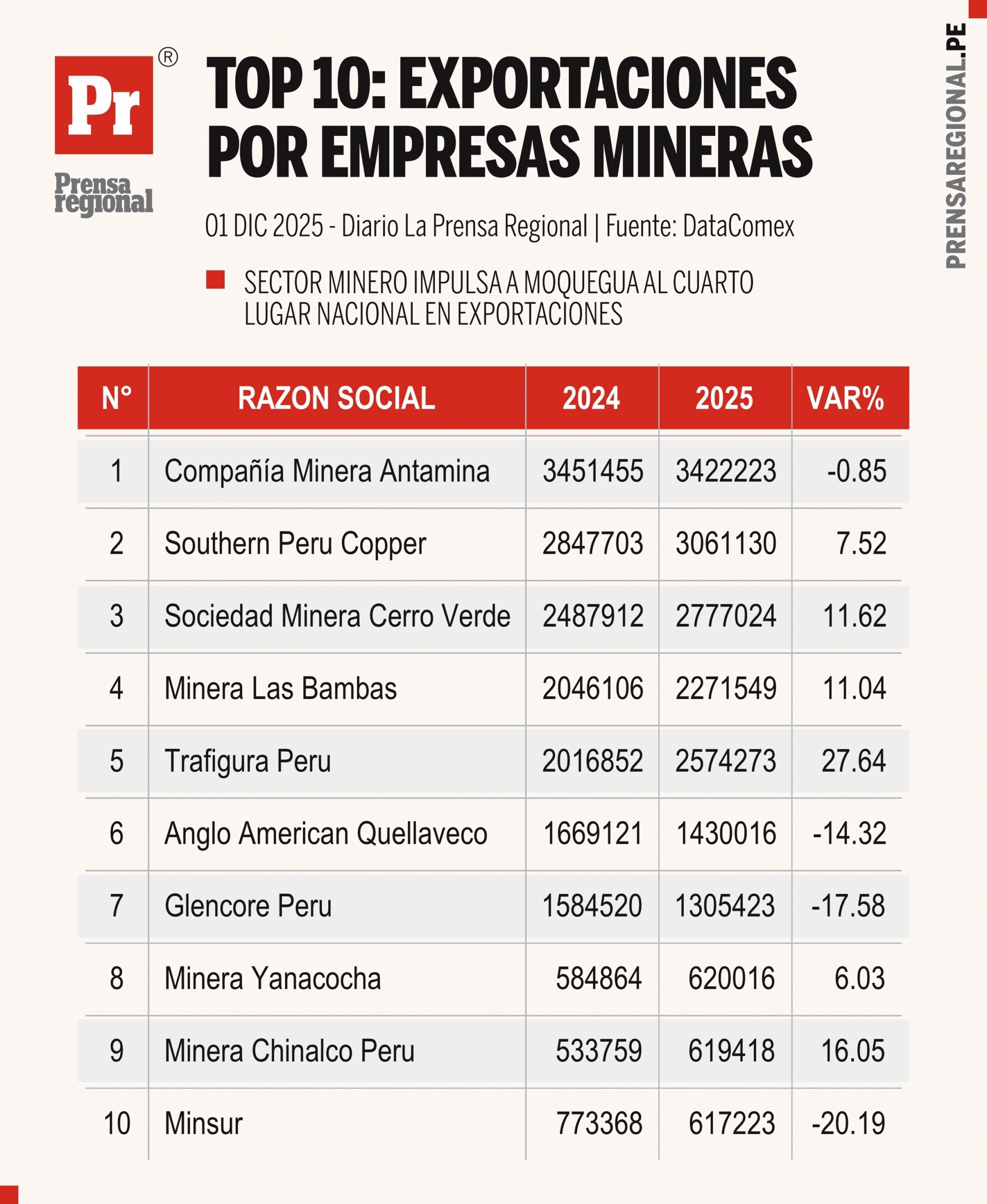 El comportamiento exportador de Moquegua reafirma su condición de región estratégica en el comercio exterior peruano, con un aparato productivo claramente orientado al sector minero. Aunque las exportaciones no tradicionales mantienen una presencia marginal, el fuerte dinamismo del cobre continúa posicionando a la región entre las más competitivas del país.