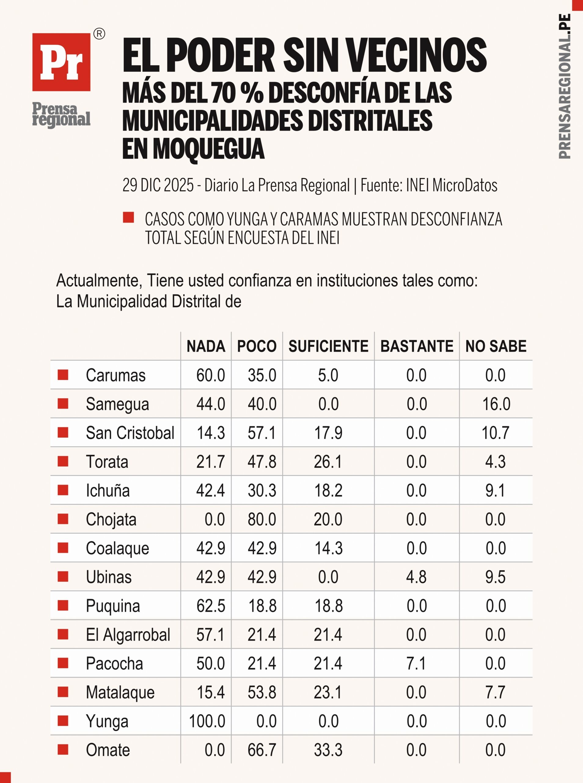 Distritos como Samegua, Coalaque, Ubinas y El Algarrobal presentan una combinación elevada de “Nada” y “Poco”, junto con porcentajes significativos de “No sabe”. Este último elemento revela no solo desconfianza, sino también desconocimiento de la gestión municipal, lo que apunta a fallas en la comunicación institucional, la rendición de cuentas y los mecanismos de participación ciudadana.