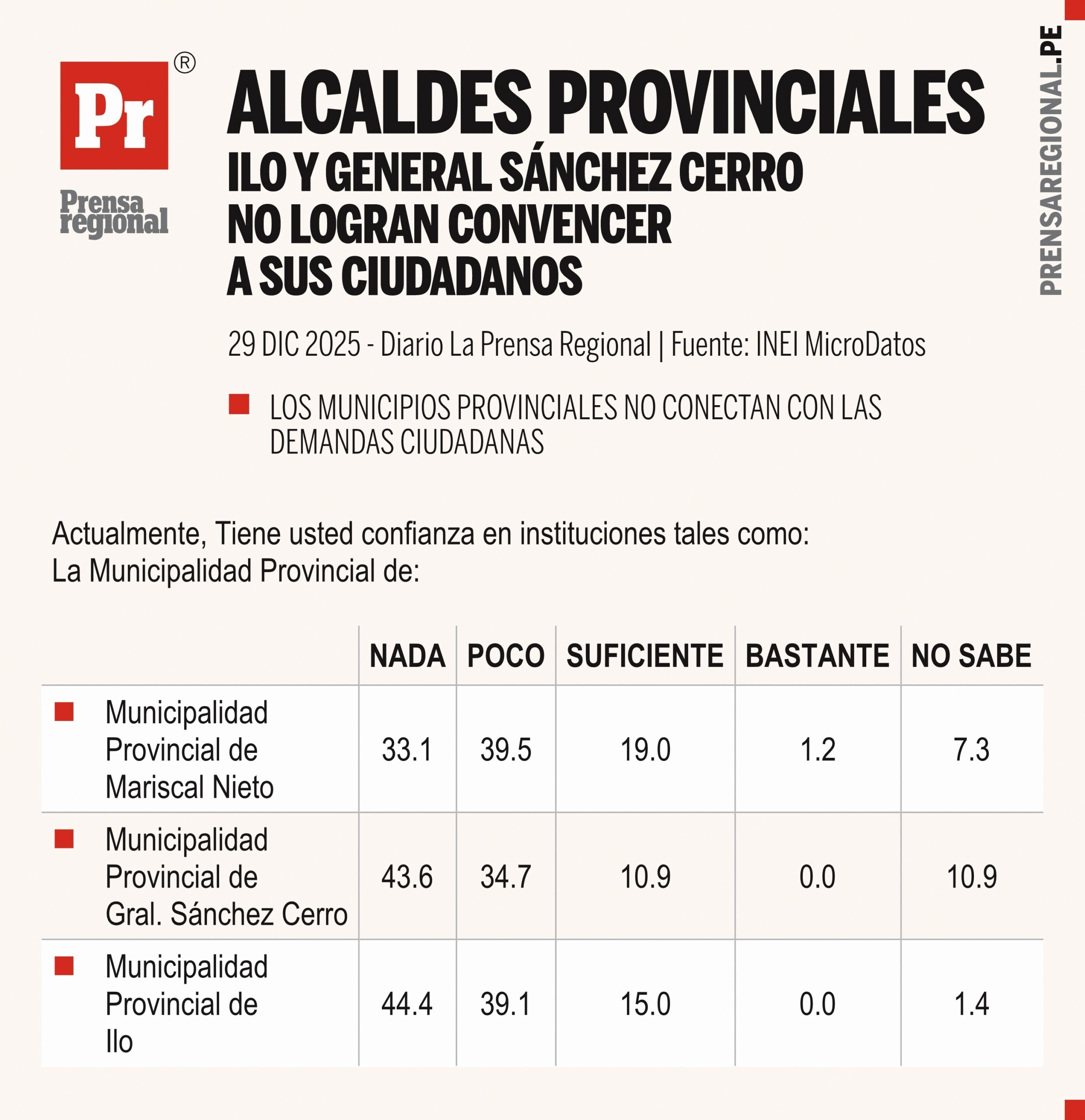 Un elemento relevante es la presencia de la categoría “No sabe”, particularmente en General Sánchez Cerro (10,9 %) y Mariscal Nieto (7,3 %). Este indicador apunta no solo a desconfianza, sino también a desconocimiento o lejanía de la ciudadanía respecto a la gestión provincial, evidenciando déficits de comunicación institucional, rendición de cuentas y mecanismos de participación.