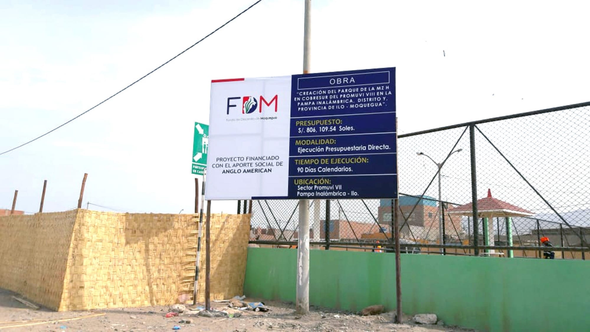 Otra de las obras que ejecuta el FDM es la “Instalación de Infraestructura Deportiva en el Parque N° 01 del A.H Juan Pablo II, PROMUVI X, Pampa Inalámbrica”, la residente de obra, Arq. Angela Aquino, manifestó que se encuentran en la etapa de movimiento de suelos donde se ha detectado que parte del terreno es relleno, recurriendo al procedimiento de arroceras, continuando con obras adicionales como la implementación del cerco perimétrico.