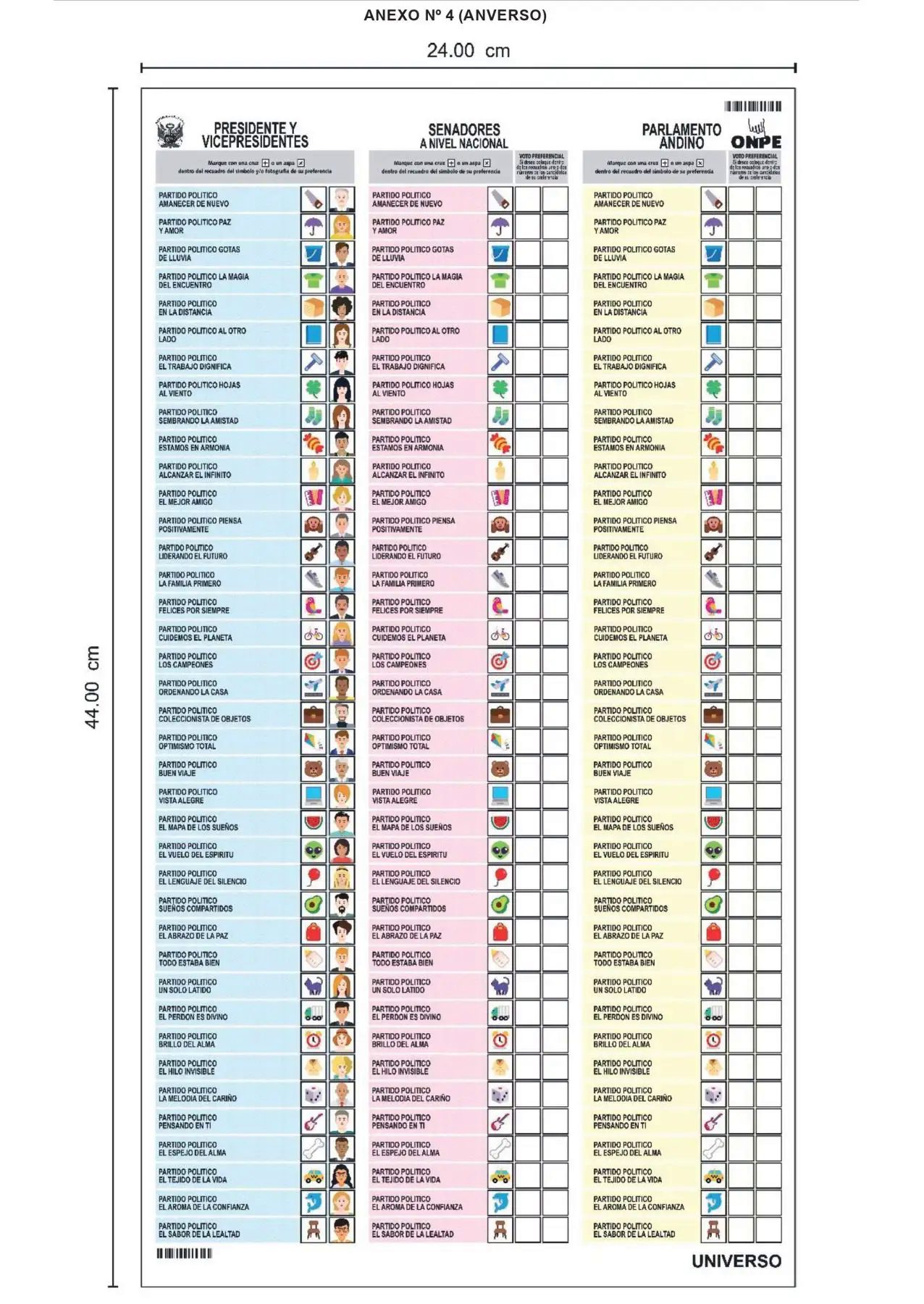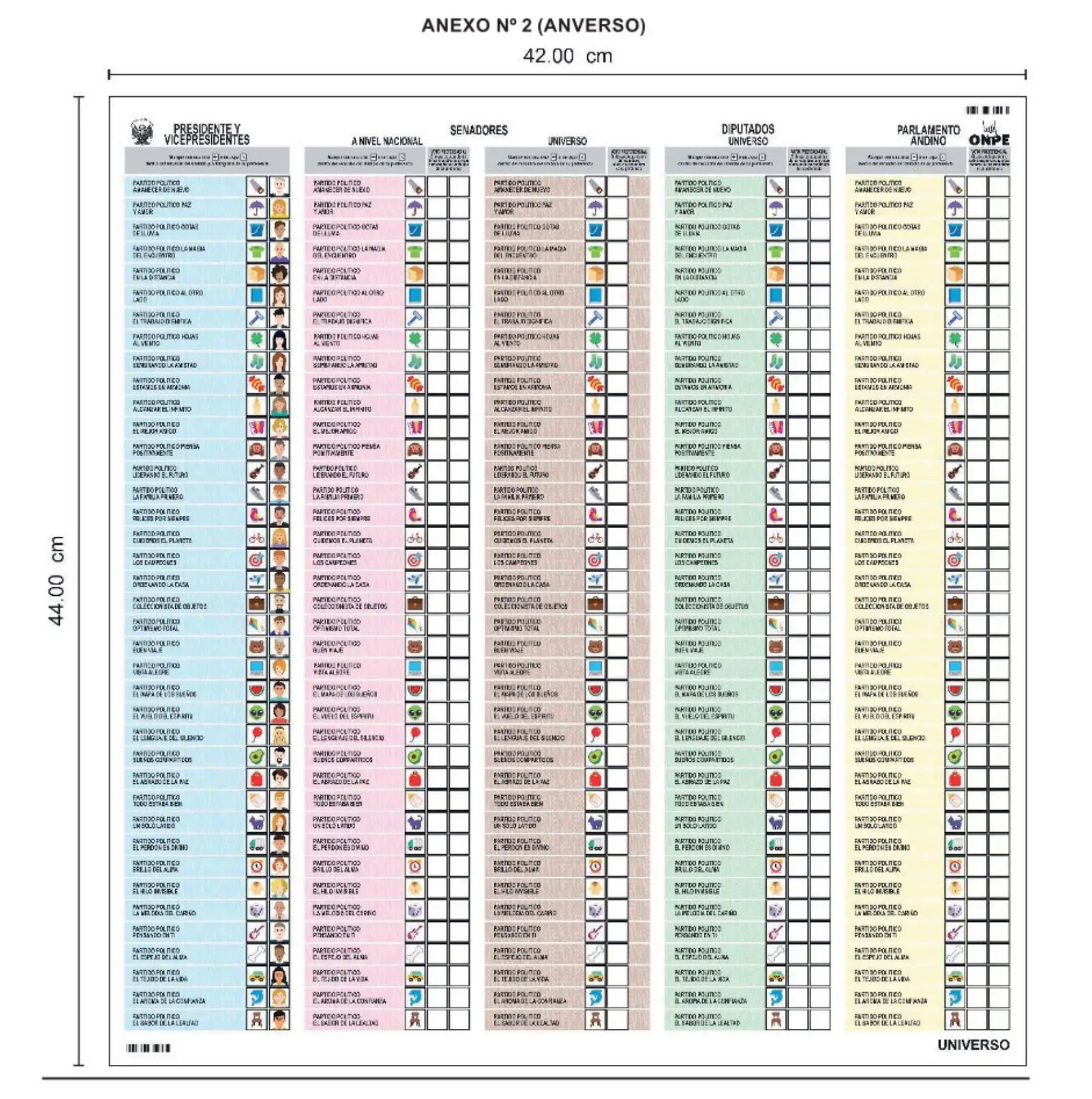 El documento estará organizado en cinco columnas, cada una correspondiente a una elección distinta: presidente y vicepresidentes, senadores a nivel nacional, senadores por región, diputados y representantes ante el Parlamento Andino.