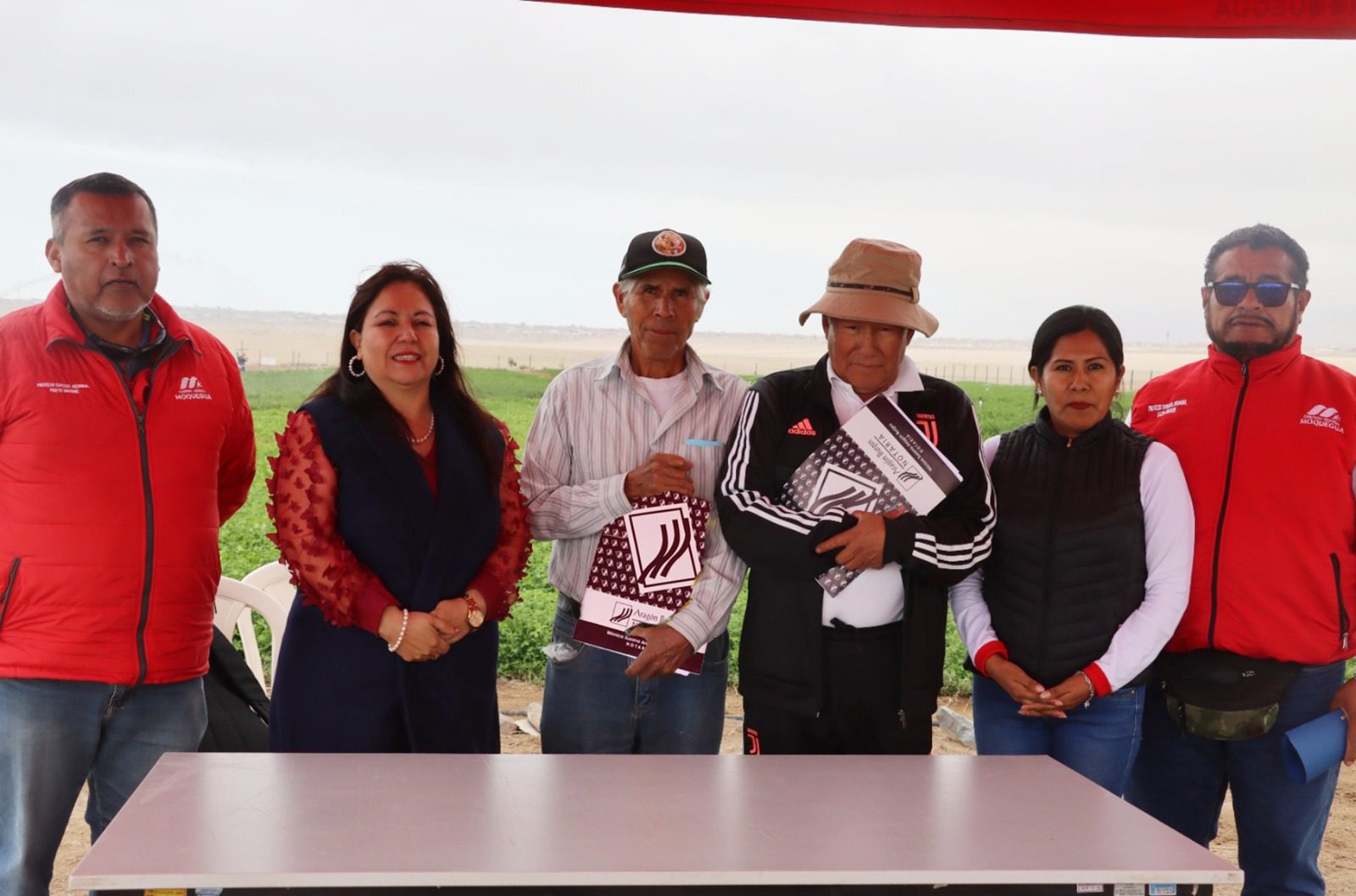 El acto simbólico se realizó en la parcela demostrativa, con la participación del gerente general del PERPG, la abogada Luz Torres, responsable del componente “Acciones para el cumplimiento del contrato de entrega de agua para el riego de lotes” del proyecto de Ampliación de la Frontera Agrícola de las Lomas de Ilo, y el representante legal del Consorcio, Saúl Luis Ticona Monge, entre otros.