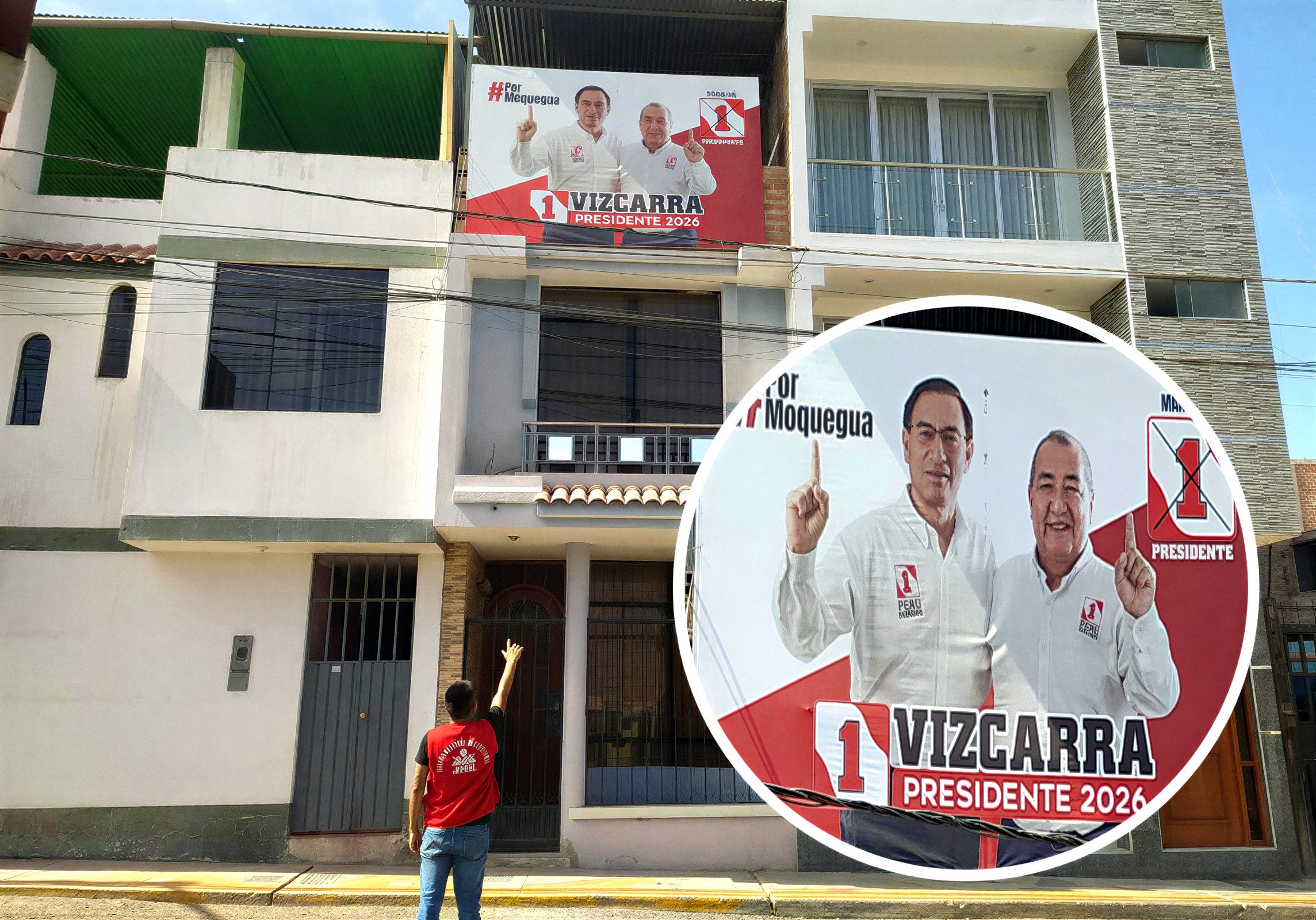 Propaganda colocada en una vivienda de Moquegua presenta a Martín Vizcarra como candidato presidencial, generando una percepción que no se ajusta a la realidad electoral.