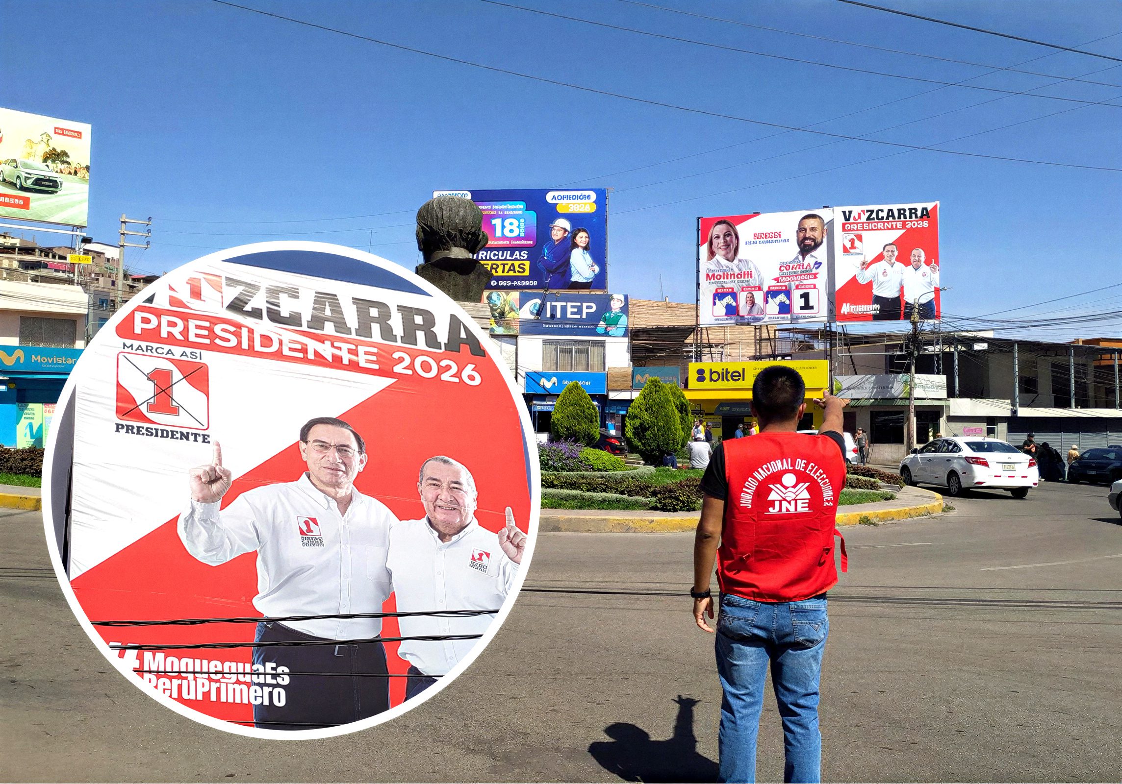 El propio informe detalla que en algunos paneles aparece también el candidato oficial del partido, generando una asociación visual y política entre ambos, lo que refuerza la percepción de candidatura atribuida a Vizcarra.