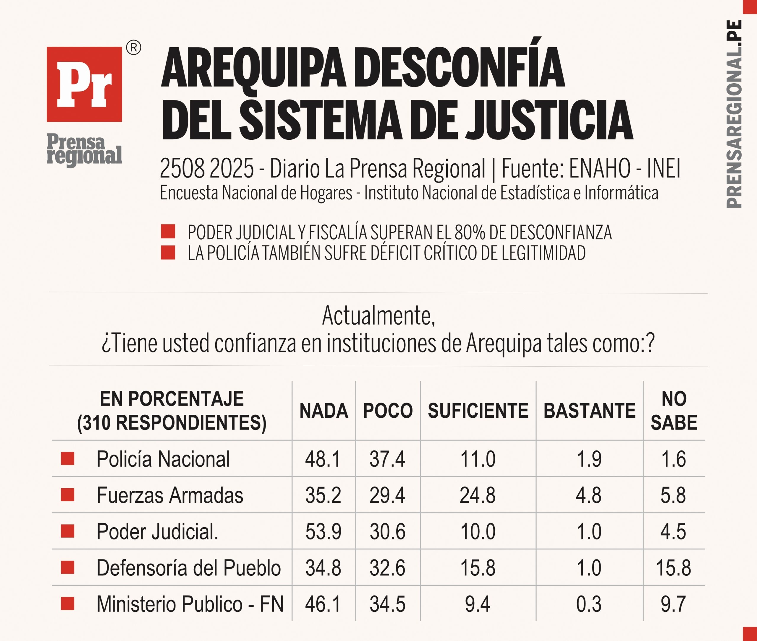 La Encuesta Nacional de Hogares – ENAHO 2025 del INEI, encuesta revela un panorama alarmante sobre la confianza ciudadana en las principales instituciones de seguridad y justicia en Arequipa. El Poder Judicial, la Fiscalía y la Policía Nacional encabezan la lista de las peor valoradas, con niveles de desconfianza que superan el 80%.