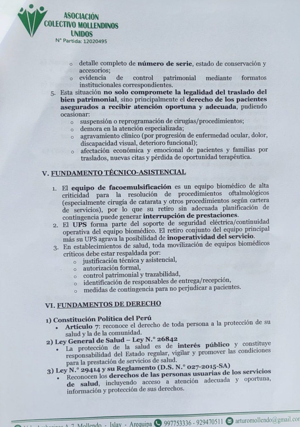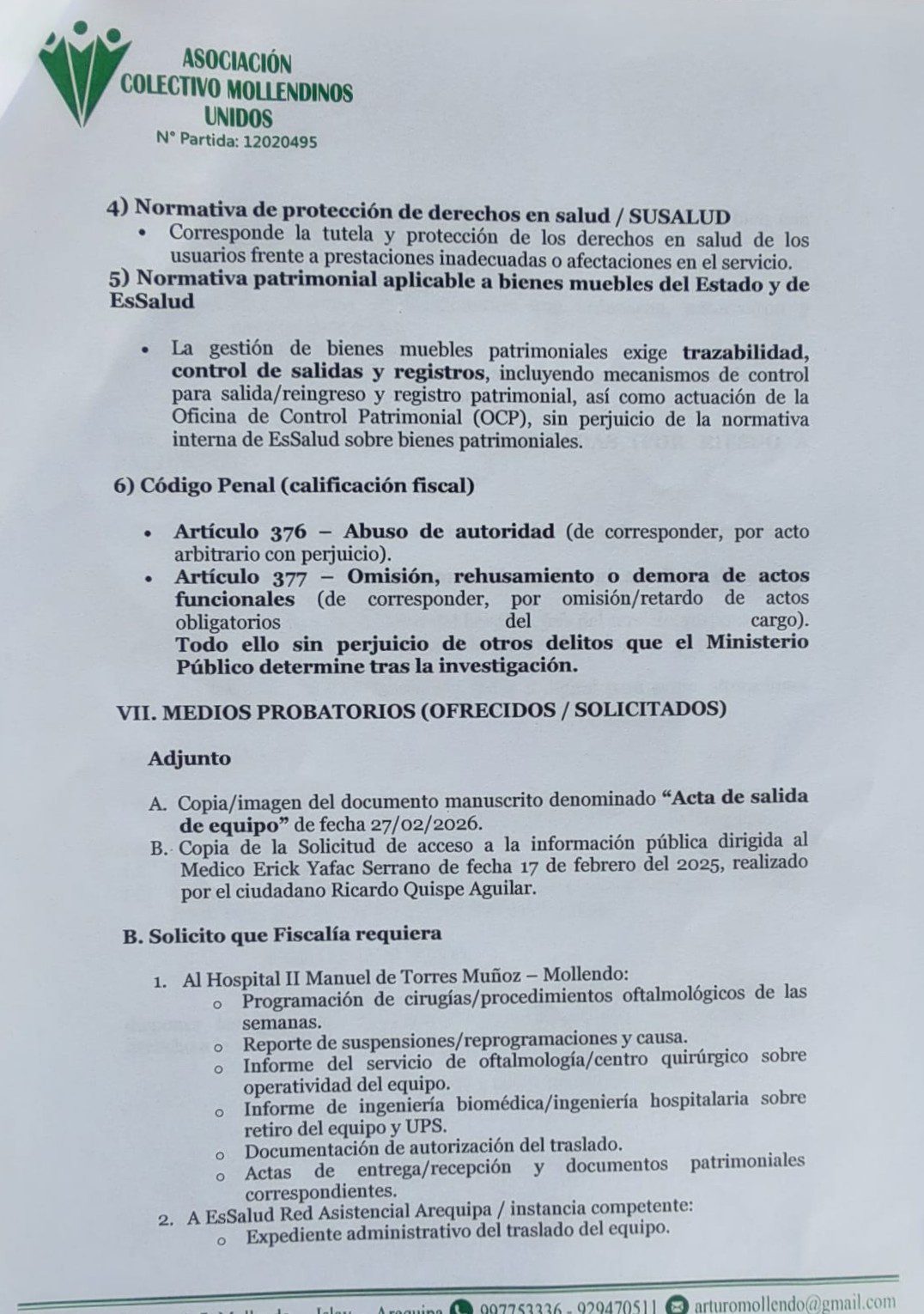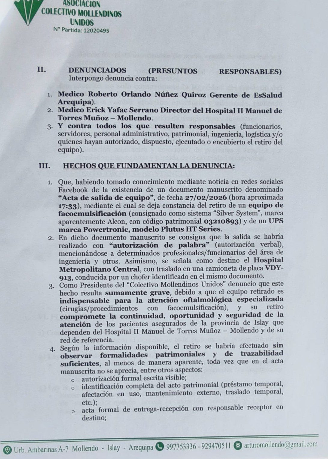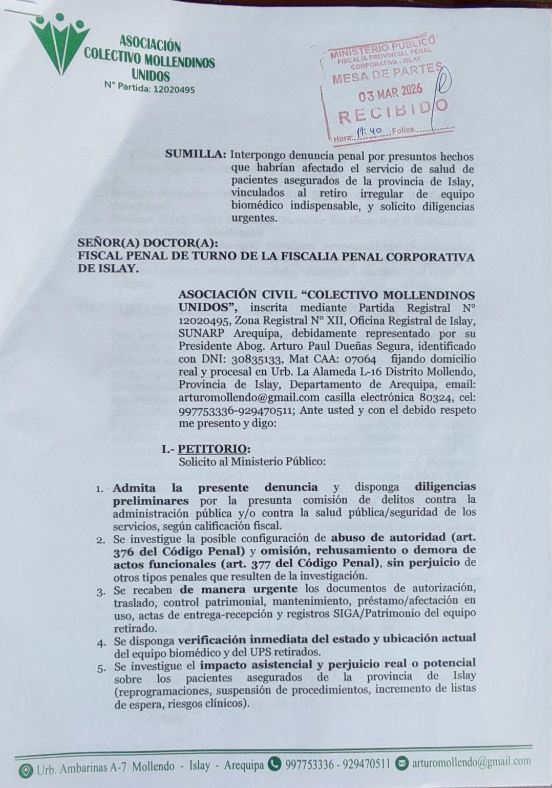 El abogado Arturo Dueñas, representante de la Asociación Colectivo Mollendinos Unidos, presentó una denuncia penal ante el Ministerio Público contra el médico Roberto Orlando Núñez Quiroz, gerente de EsSalud Arequipa, y el médico Erick Yafac Serrano, director del Hospital II Manuel Torres Muñoz de Mollendo, así como contra quienes resulten responsables, por el presunto hecho vinculado al retiro irregular de un equipo biomédico (facoemulsificador) indispensable para la atención de pacientes asegurados de la provincia de Islay.