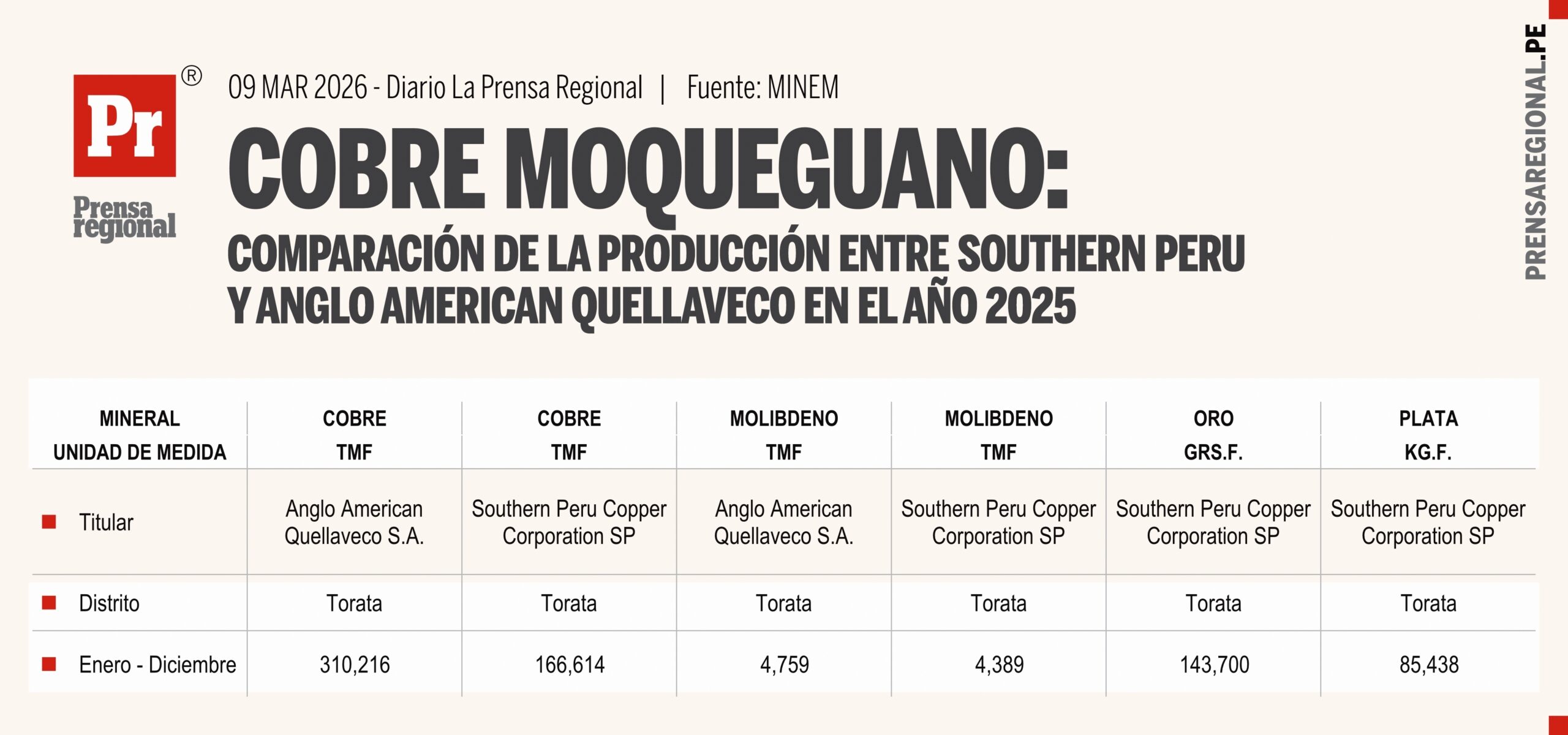 En 2025, Quellaveco produce 310,216 TMF de cobre frente a 166,614 TMF de SPCC, mientras ambas operaciones mantienen recuperación relevante de molibdeno.