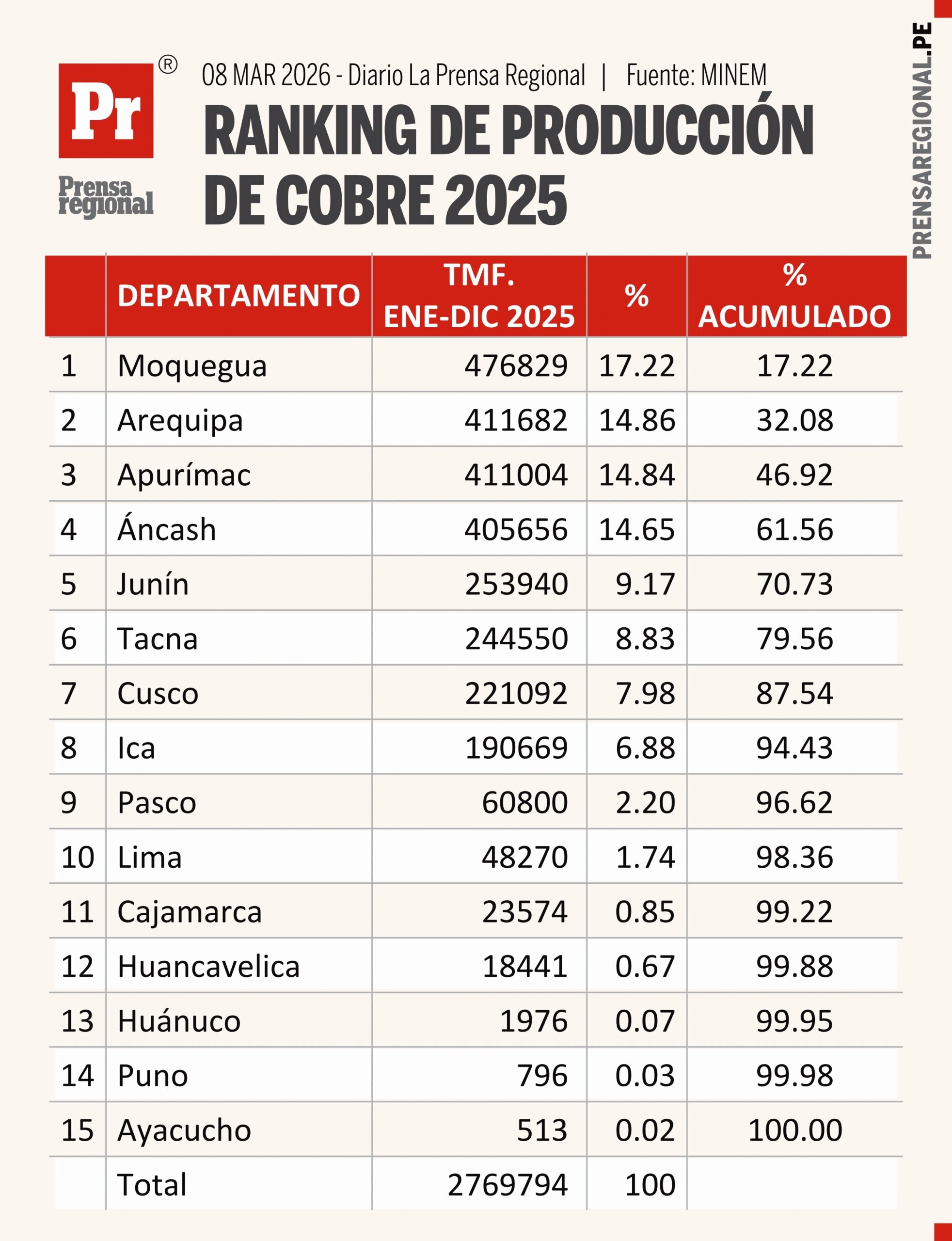 Moquegua lidera la producción nacional con 476,829 TMF (cuatrocientas setenta y seis mil ochocientas veintinueve toneladas métricas finas), lo que representa 17.22% del total del país. Este resultado se explica principalmente por la operación de Anglo American Quellaveco, uno de los proyectos cupríferos más importantes del país, junto con el histórico complejo de Cuajone. La consolidación de ambos activos posiciona a Moquegua como el principal polo cuprífero nacional.