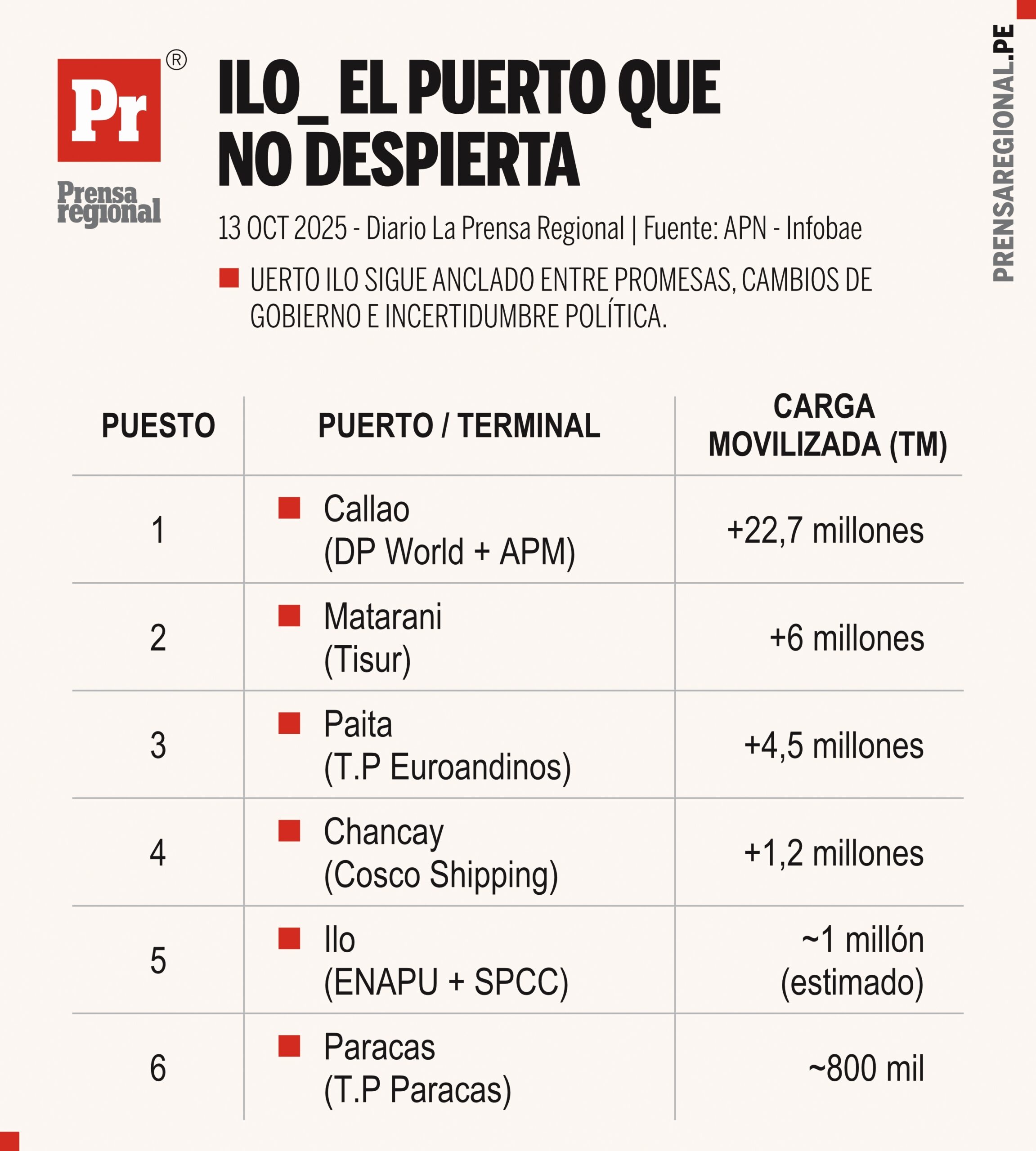 Según estimaciones de Infobae e IA Ilo (ENAPU + SPCC), en lo que va del año el puerto moviliza poco más de un millón de toneladas métricas, una cifra baja si se compara con otros terminales: Callao (DP World + APM) con 23 millones de TM, Matarani (Tisur) con 6 millones, Paita (Terminales Portuarios Euroandinos) con 4.5 millones y Chancay (Cosco Shipping) con 1.2 millones.