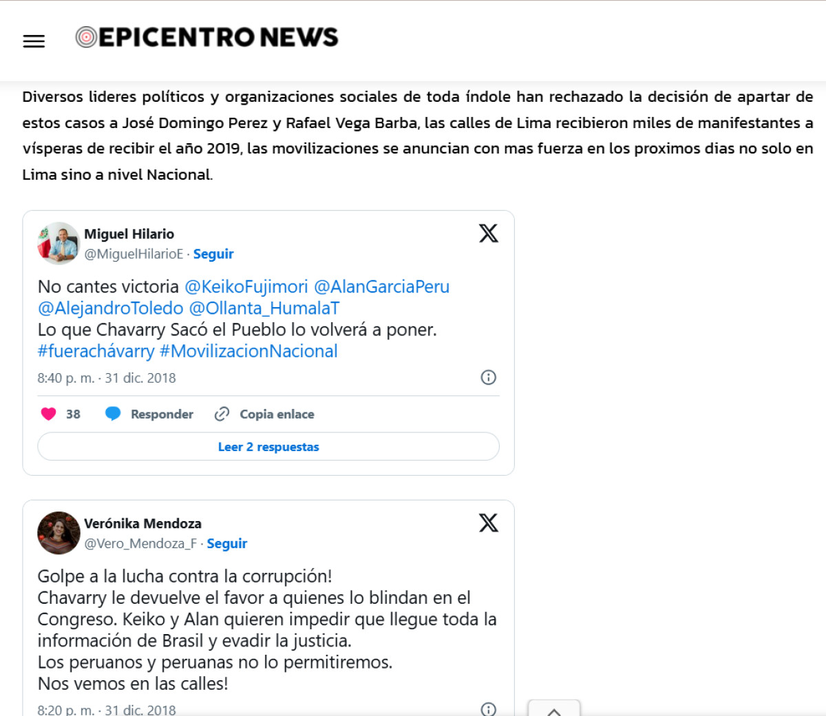 El partido político Fuerza Ciudadana, del que Yarlequé es fundador y secretario general, también difundió las publicaciones de Epicentro News (1, 2).