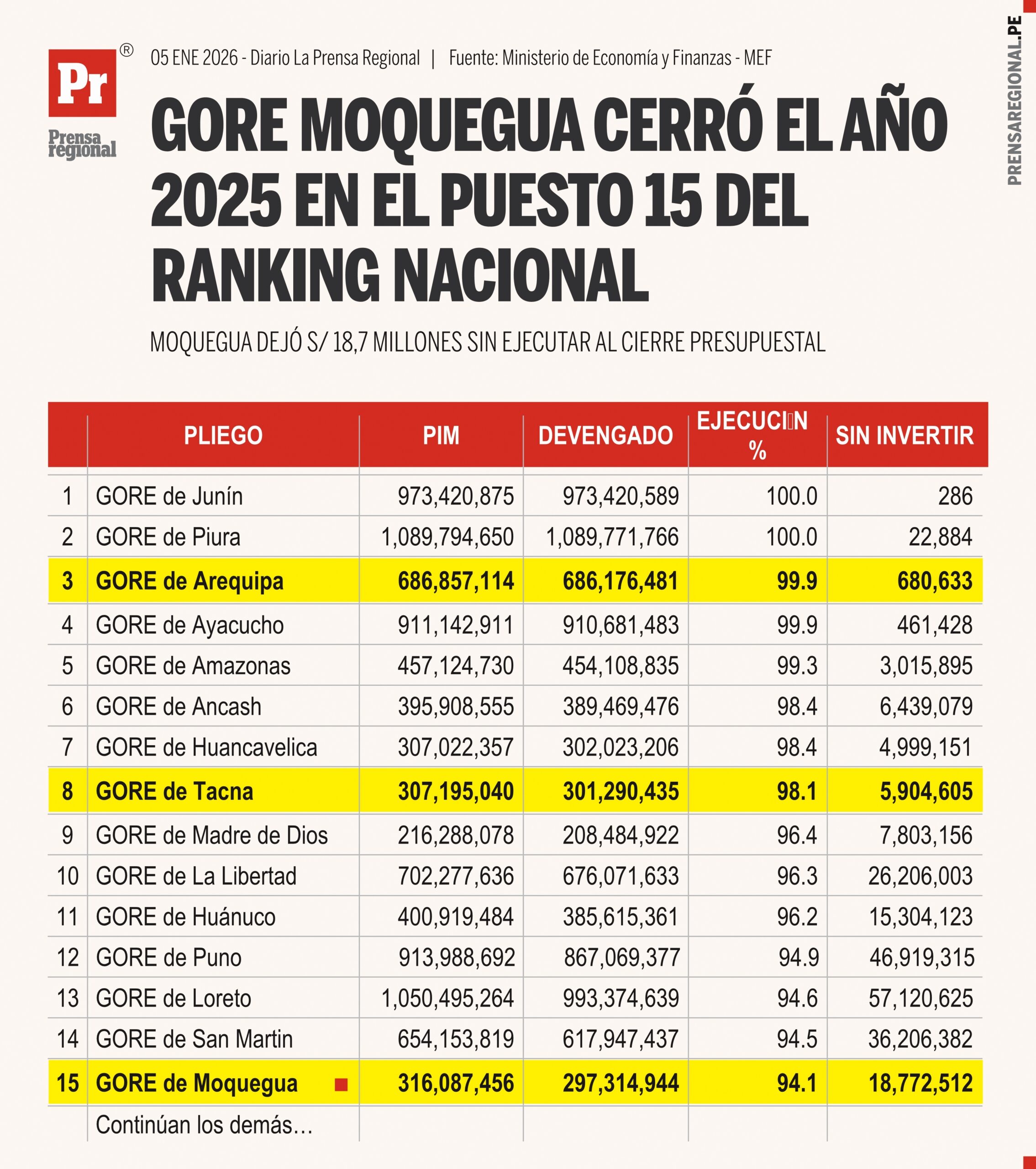 La ejecución presupuestal de los gobiernos regionales en 2025 revela marcadas diferencias en eficiencia y eficacia en el uso de los recursos públicos. Mientras algunas regiones lograron ejecutar la totalidad de su Presupuesto Institucional Modificado (PIM), otras mostraron brechas relevantes. En este escenario comparativo, el Gobierno Regional de Moquegua terminó ubicado en el puesto 15 del ranking nacional.