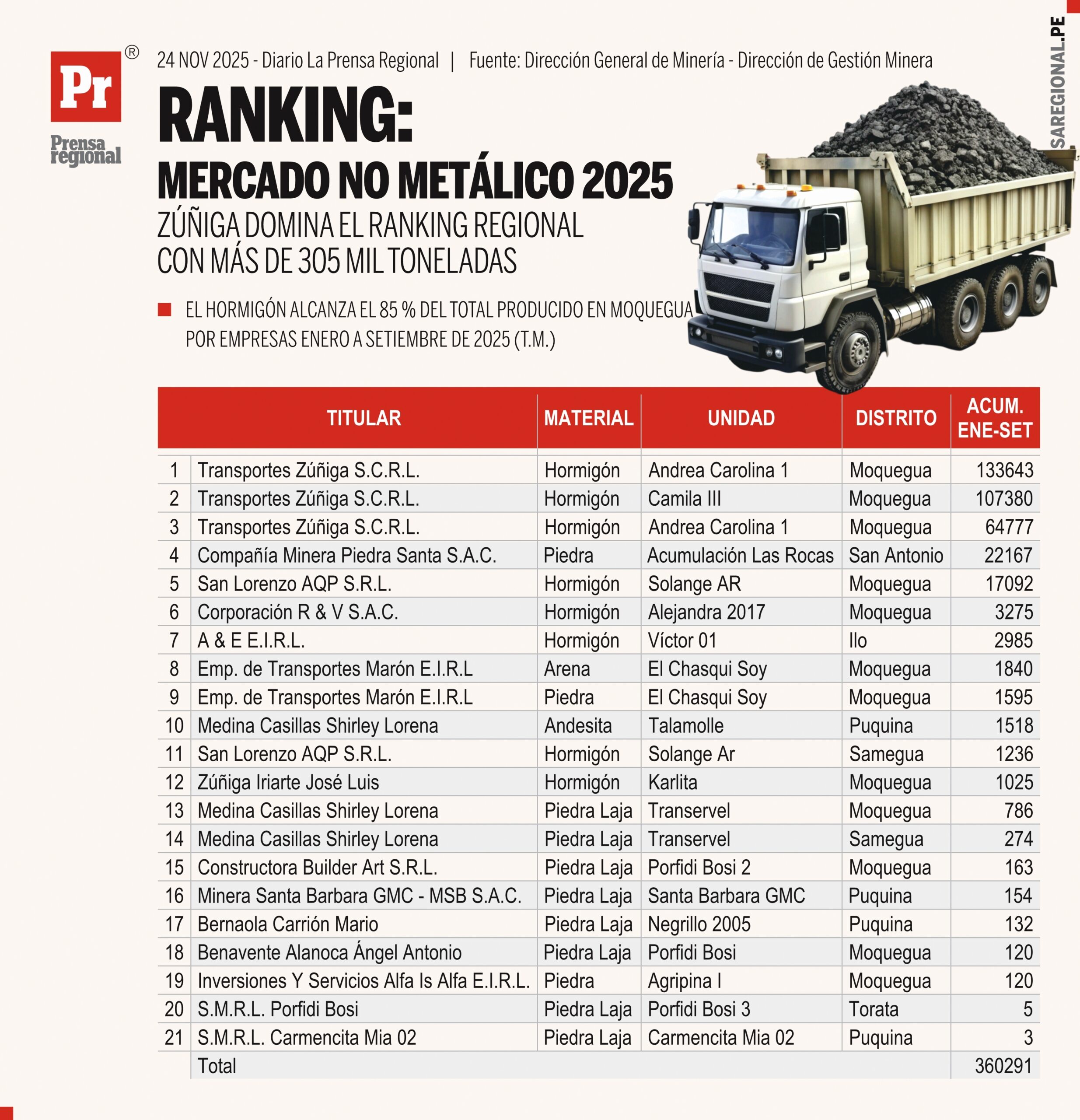 El ranking evidencia un ecosistema no metálico altamente concentrado, con un liderazgo dominante de Transportes Zuñiga S.C.R.L. y una producción regional orientada casi exclusivamente al hormigón. Aunque existen pequeñas unidades productivas de piedra, laja y andesita, su impacto sigue siendo marginal.