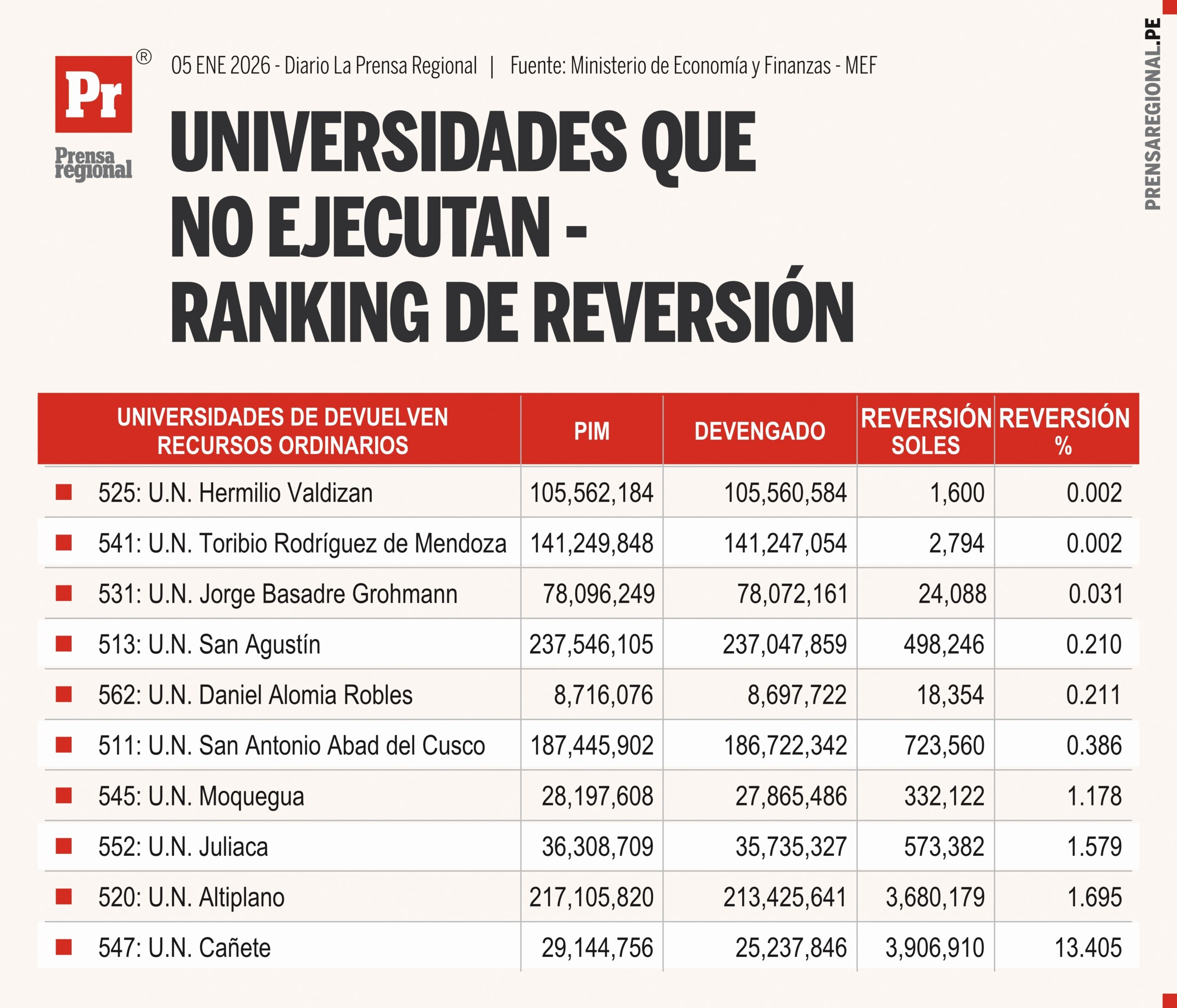 En contraste, destacan negativamente universidades con elevados montos revertidos, como la Universidad Nacional del Altiplano (S/ 3,68 millones) y la Universidad Nacional de Cañete (S/ 3,91 millones), cifras que revelan serias limitaciones en su capacidad de ejecución presupuestal.