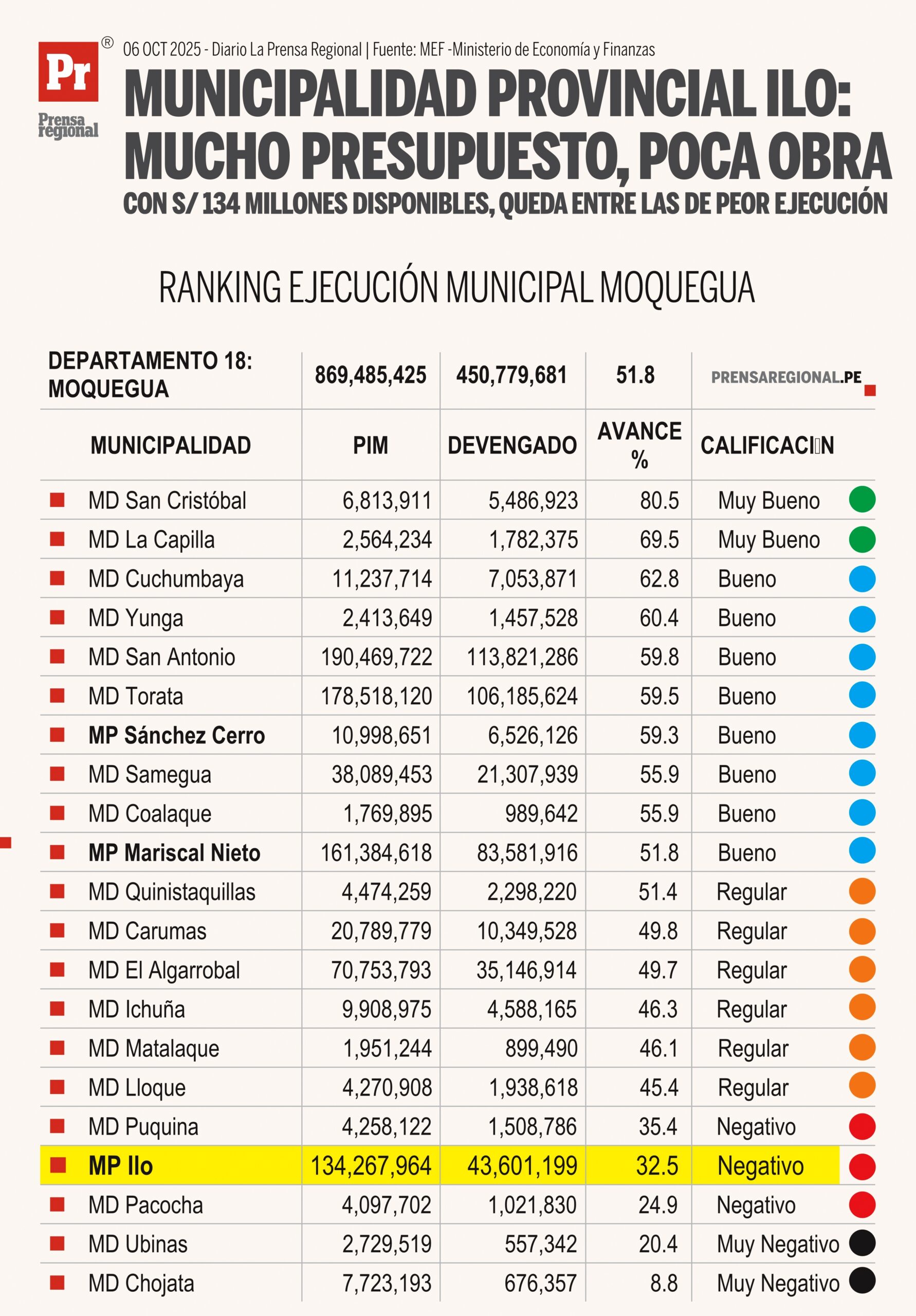 El ranking regional de ejecución presupuestal al cierre del tercer trimestre de 2025 revela un desempeño desigual entre los gobiernos locales de Moquegua. Mientras distritos como San Cristóbal y La Capilla alcanzan niveles sobresalientes de inversión pública, la Municipalidad Provincial de Ilo, pese a contar con uno de los presupuestos más altos del departamento, figura entre las de menor ejecución, con apenas 32.5% de avance, muy por debajo del promedio regional de 51.8%.