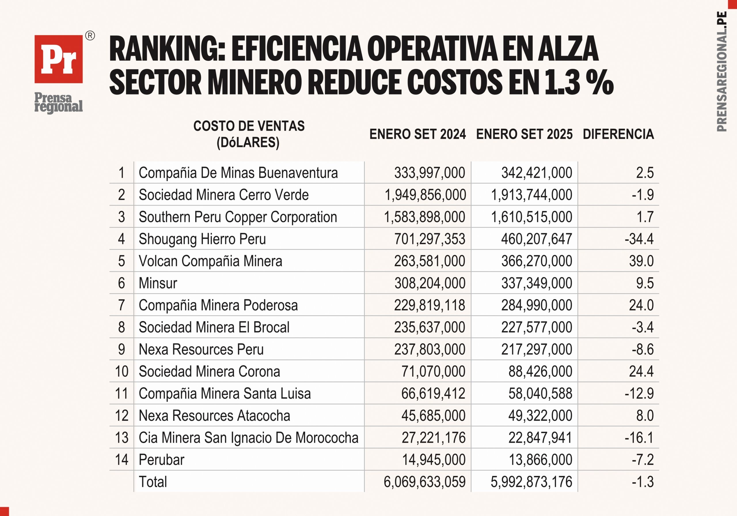 El análisis consolidado de los estados financieros de las principales empresas mineras del país en la Bolsa de Valores de Lima (BVL) revela una reducción global del 1.3% en el costo de ventas, al pasar de US$ 6,069 millones (seis mil sesenta y nueve millones de dólares) en 2024 a US$ 5,992 millones (cinco mil novecientos noventa y dos millones de dólares) en 2025.