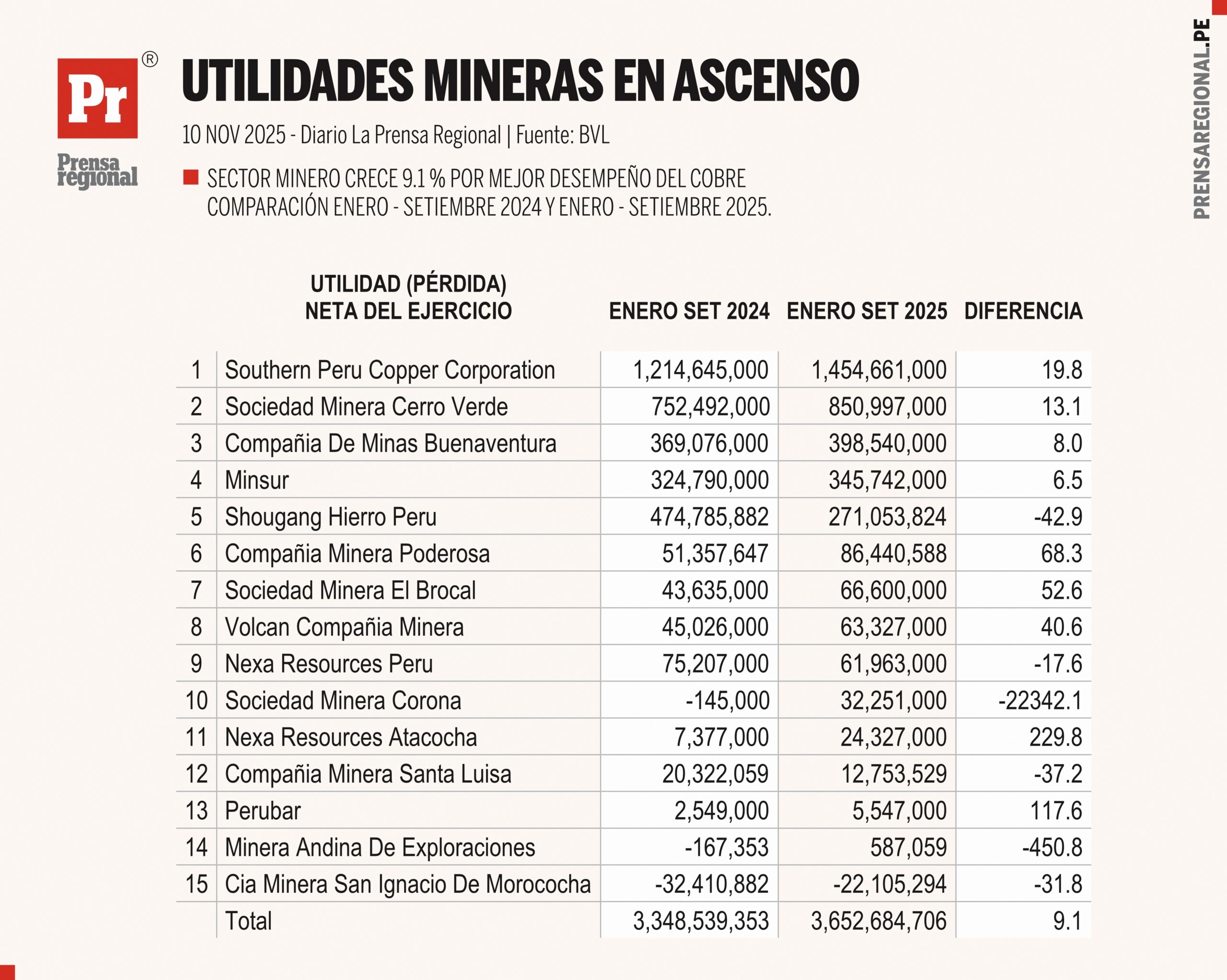 El análisis de los estados financieros consolidados de quince empresas mineras evidencia un crecimiento agregado de las utilidades netas del 9.1% entre enero y setiembre de 2025, en comparación con el mismo periodo de 2024, de acuerdo con información de la Bolsa de Valores de Lima (BVL).
