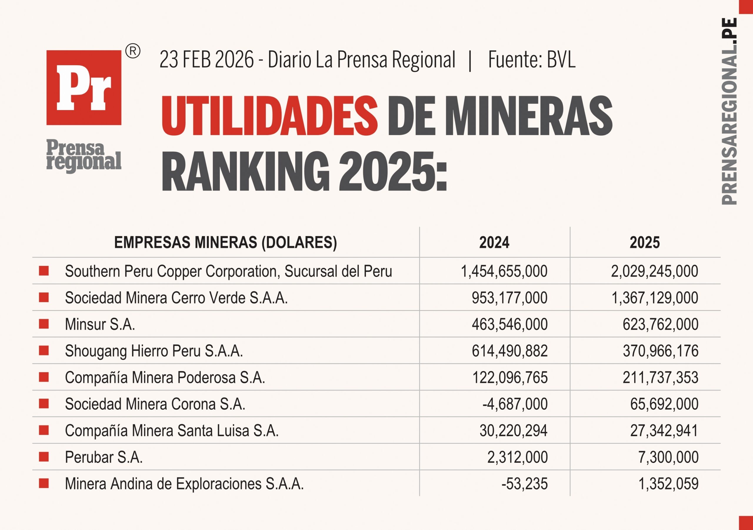 Southern Peru Copper Corporation, Sucursal del Perú encabeza el ranking con una utilidad neta de US$ 2,029,245,000 (dos mil veintinueve millones doscientos cuarenta y cinco mil dólares), frente a US$ 1,454,655,000 en 2024, lo que representa un crecimiento interanual aproximado de 39.5%.