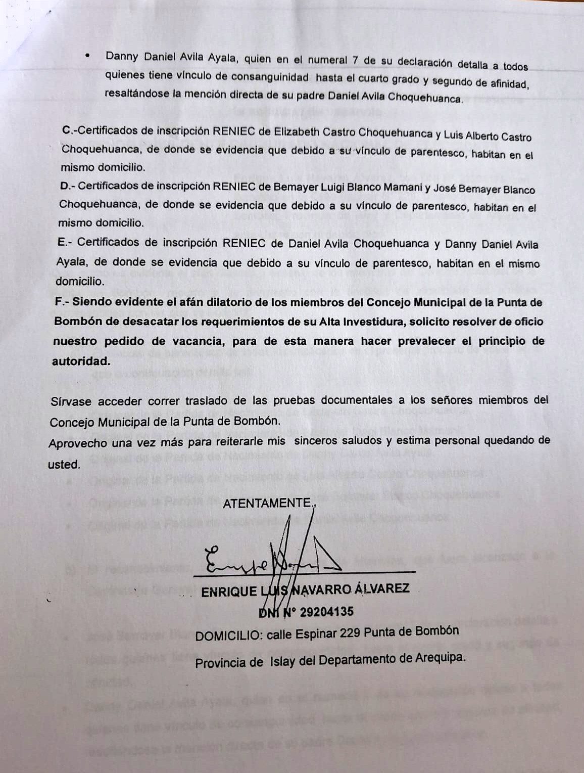 Navarro Álvarez fundamenta su reclamo en la existencia de vínculos de consanguinidad y afinidad entre diversos implicados en el proceso de vacancia. Entre las pruebas presentadas figuran partidas de nacimiento originales de ciudadanos como Elizabeth Castro Choquehuanca, Bemayer Luigi Blanco Mamani y Danny Daniel Avila Ayala, además de certificados de inscripción de Reniec que demostrarían que los involucrados comparten el mismo domicilio real.