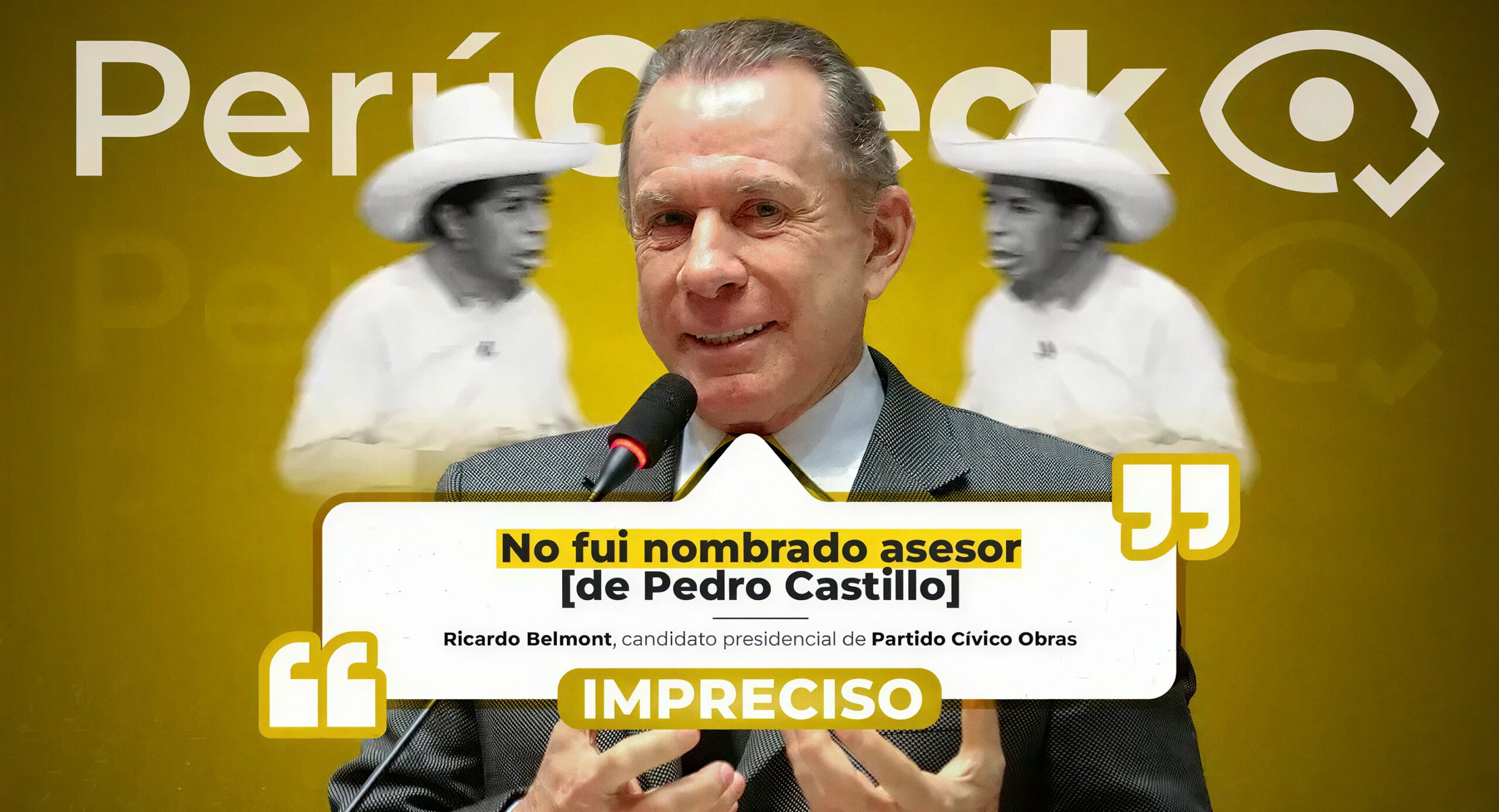Pese a que en 2021 el presidente Pedro Castillo anunció que Ricardo Belmont se unía a su equipo de asesores en el Despacho Presidencial, nunca se oficializó el cargo. Sin embargo, esto no implica que el exalcalde de Lima no haya asesorado por unos días al entonces jefe de Estado. Por este motivo, PerúCheck califica las declaraciones del candidato a la presidencia por el Partido Cívico Obras como imprecisas.