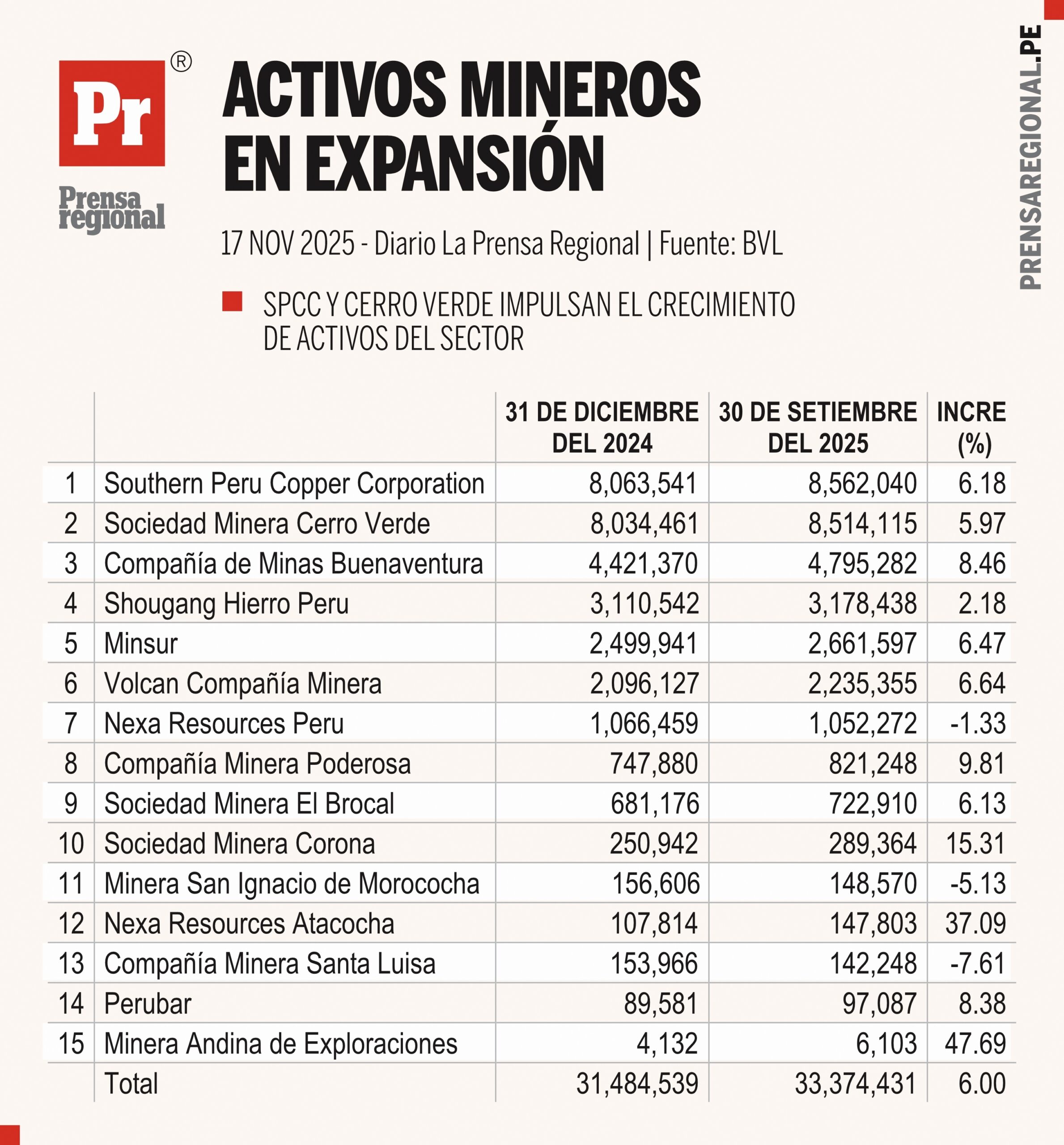 La comparación de activos entre el cierre de diciembre de 2024 y septiembre de 2025 revela un comportamiento heterogéneo en la industria minera peruana, caracterizado por un crecimiento agregado del 6%, pasando de USD 31,484 millones a USD 33,374 millones. Este incremento global confirma que el sector continúa en una fase de reinversión y ampliación de capacidad, aunque con importantes diferencias entre las empresas.