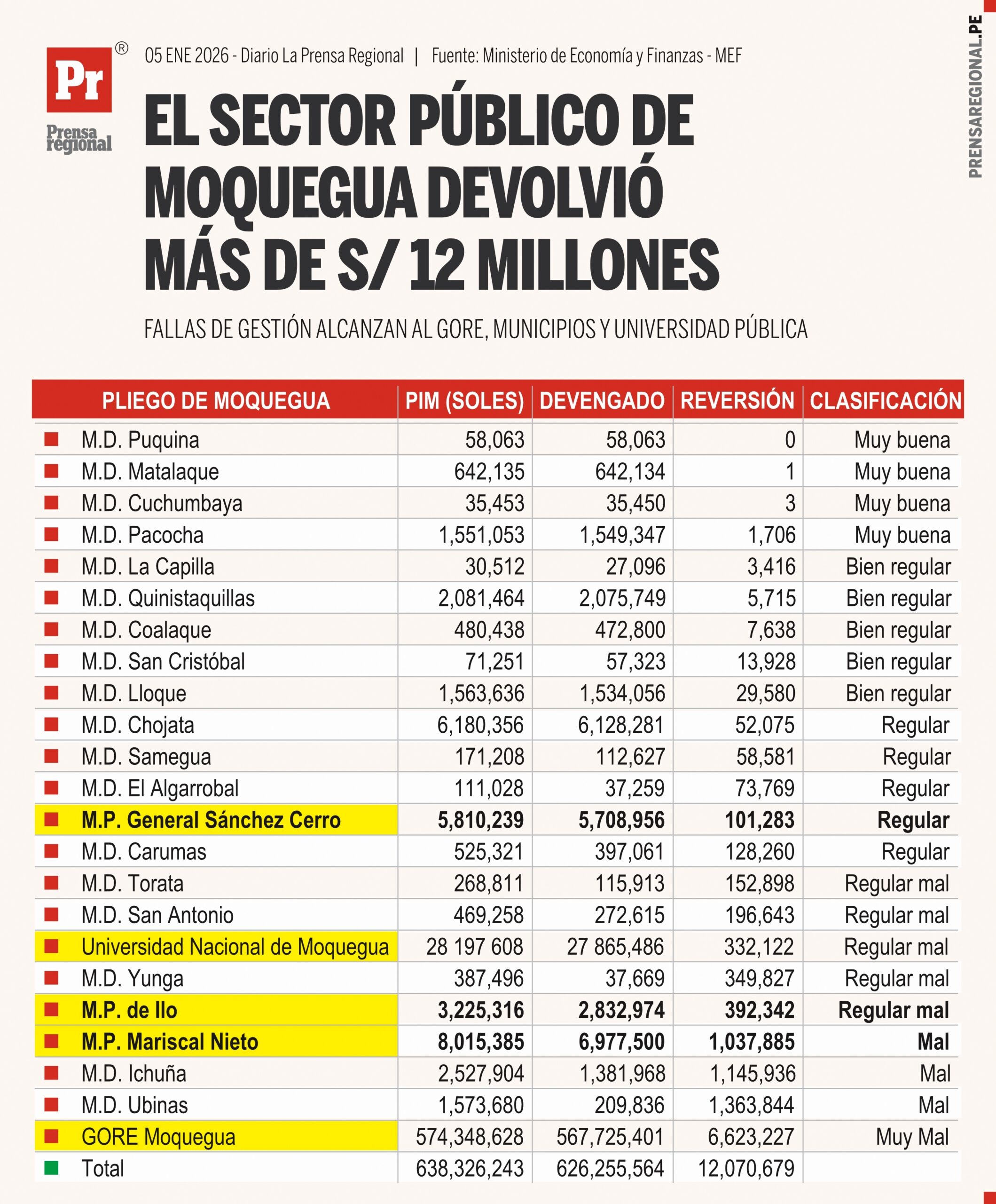 Resulta especialmente grave el desempeño del Gobierno Regional de Moquegua, que devuelve S/ 6,623,227, el monto más alto del cuadro, recibiendo una calificación “Muy mal”.