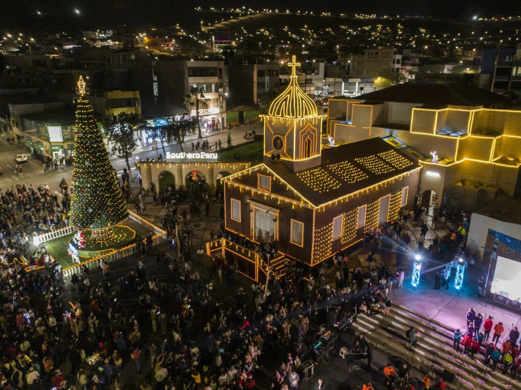 El tradicional encendido de luces se inició el último jueves en la iglesia San Jerónimo de Ilo y estuvo a cargo del Director de Operaciones de Southern Perú Ilo, Ing. Manuel Munguía Aguirre, acompañado del alcalde provincial Sr. Gerardo Carpio. Continuó el viernes en la Co Catedral Santo Domingo de Moquegua donde se instalaron, hasta 48 metros de altura de luces tipo led y neón de bajo consumo energético, que incluyeron luces y torres.