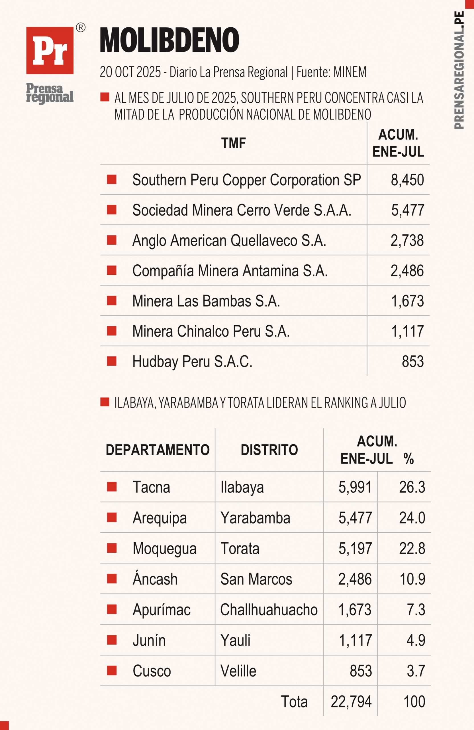 El distrito de Ilabaya (Tacna) encabeza la producción con 5,991 toneladas métricas finas (TMF), equivalente al 26.3% del total nacional, posicionándose como el principal núcleo de molibdeno del Perú.