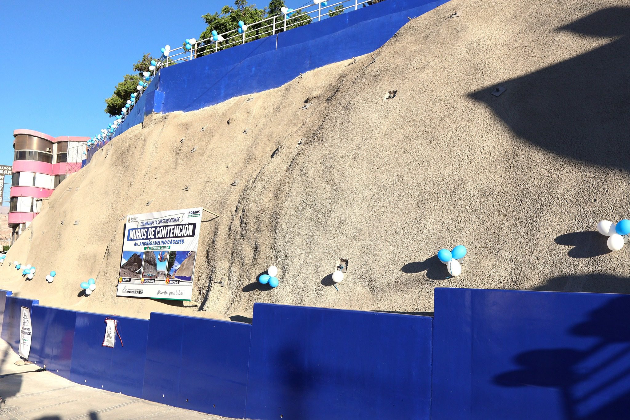 Con un sistema moderno compuesto por malla y forrado con concreto, se resolvió el latente peligro de caída de piedras de la cima del cerro ubicado frente al grifo El Gallito. La obra financiada por el Municipio Provincial de Mariscal Nieto quedó ok y ahora ya no hay riesgo de que caigan piedras afectando a transportistas y transeúntes.
