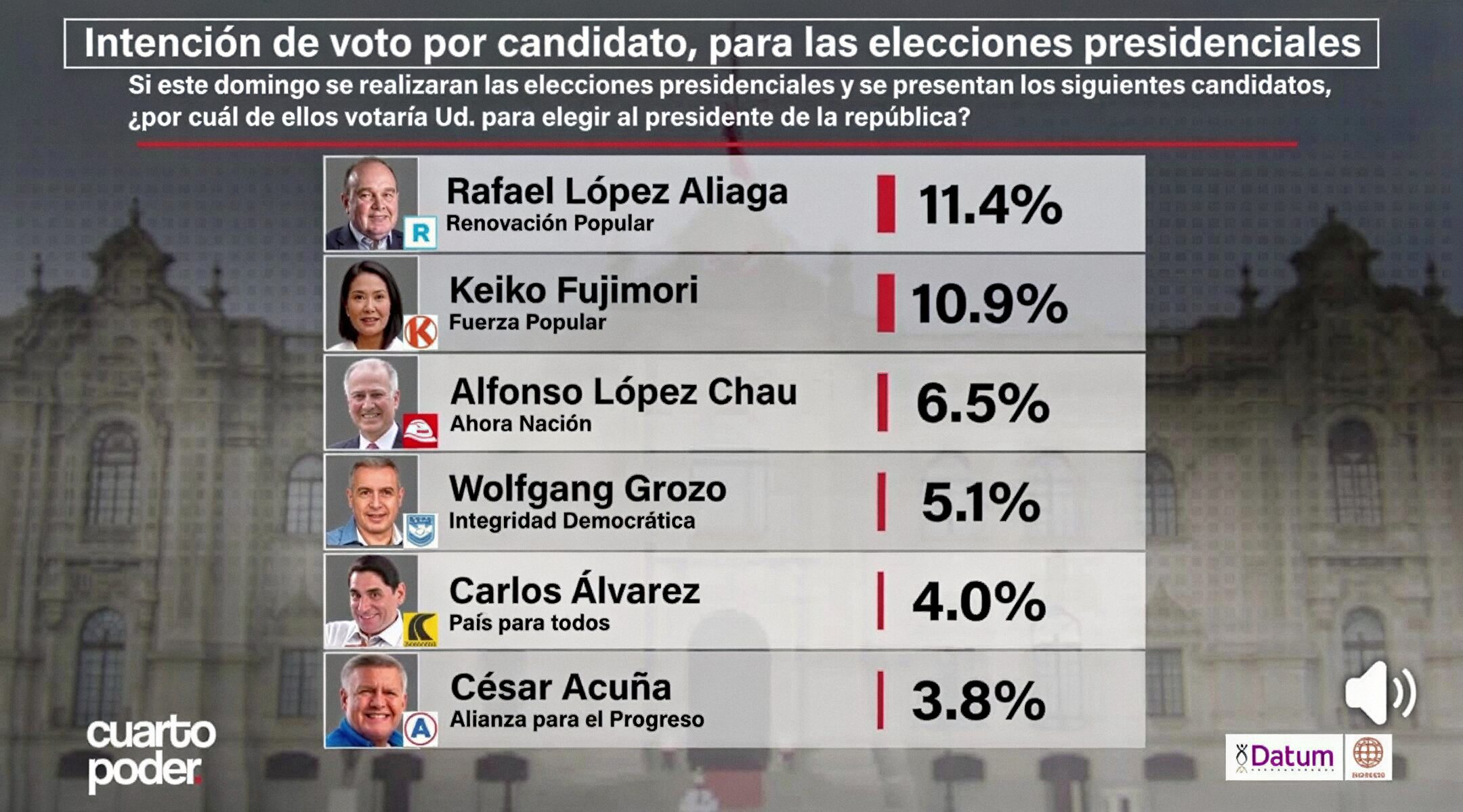 En la última encuesta de Ipsos, de más de 30 organizaciones políticas solo seis tendrían presencia en el Congreso nacional en el siguiente orden: Fuerza Popular, Renovación Popular, Alianza para el Progreso, Somos Perú, Juntos por el Perú y País para Todos.