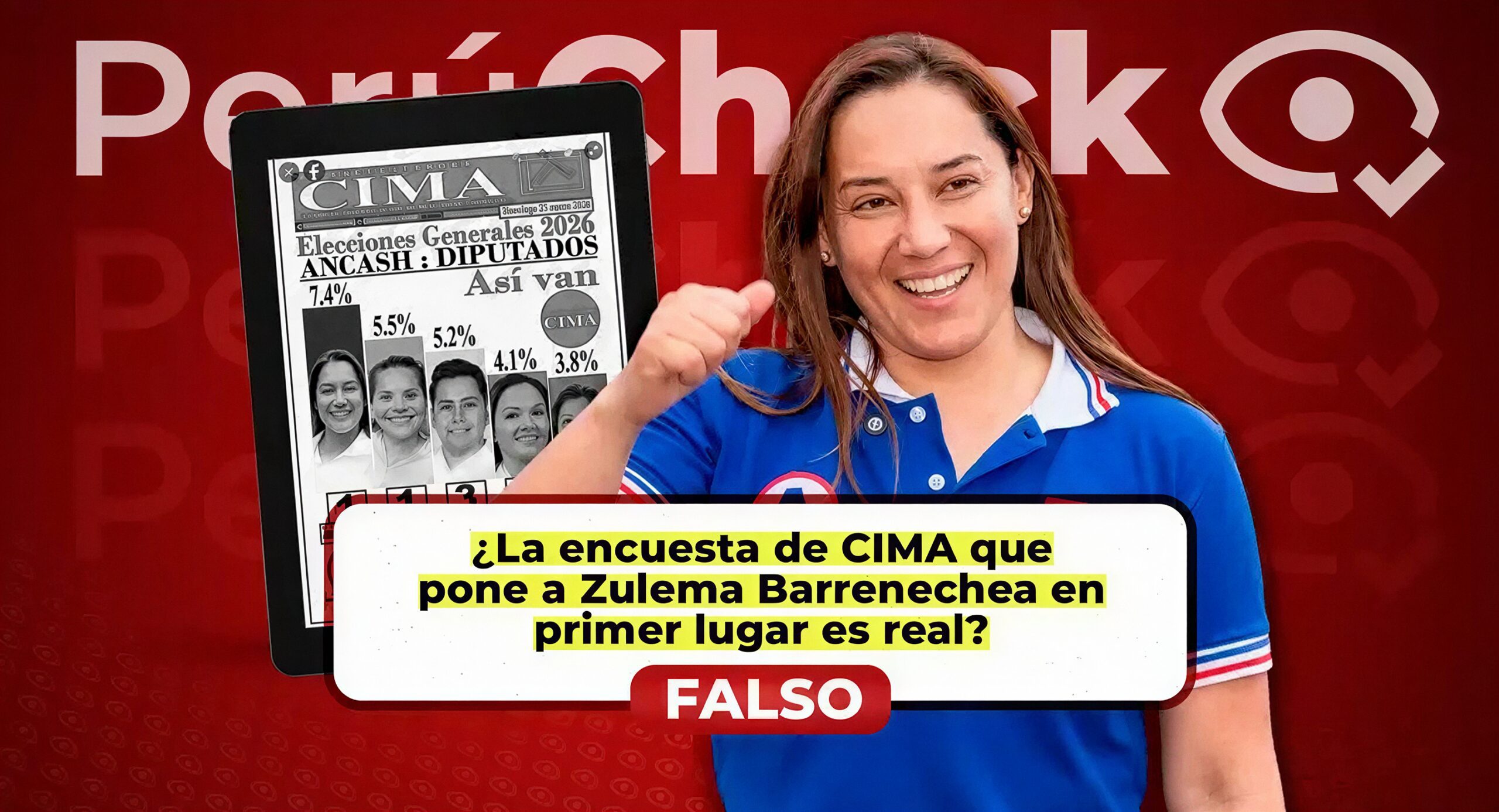 Sin embargo, la información difundida no coincide con el sondeo original publicado por CIMA el 25 de enero de 2026. En dicho sondeo, el primer lugar corresponde a Yuliana Meza, candidata de Renovación Popular, con 7.4%. Le siguen Maka Gamarra con 5.5%, Beto Ugarte con 5.2%, Zulema Barrenechea con 4.1% y Eunice Dextre con 3.8%.