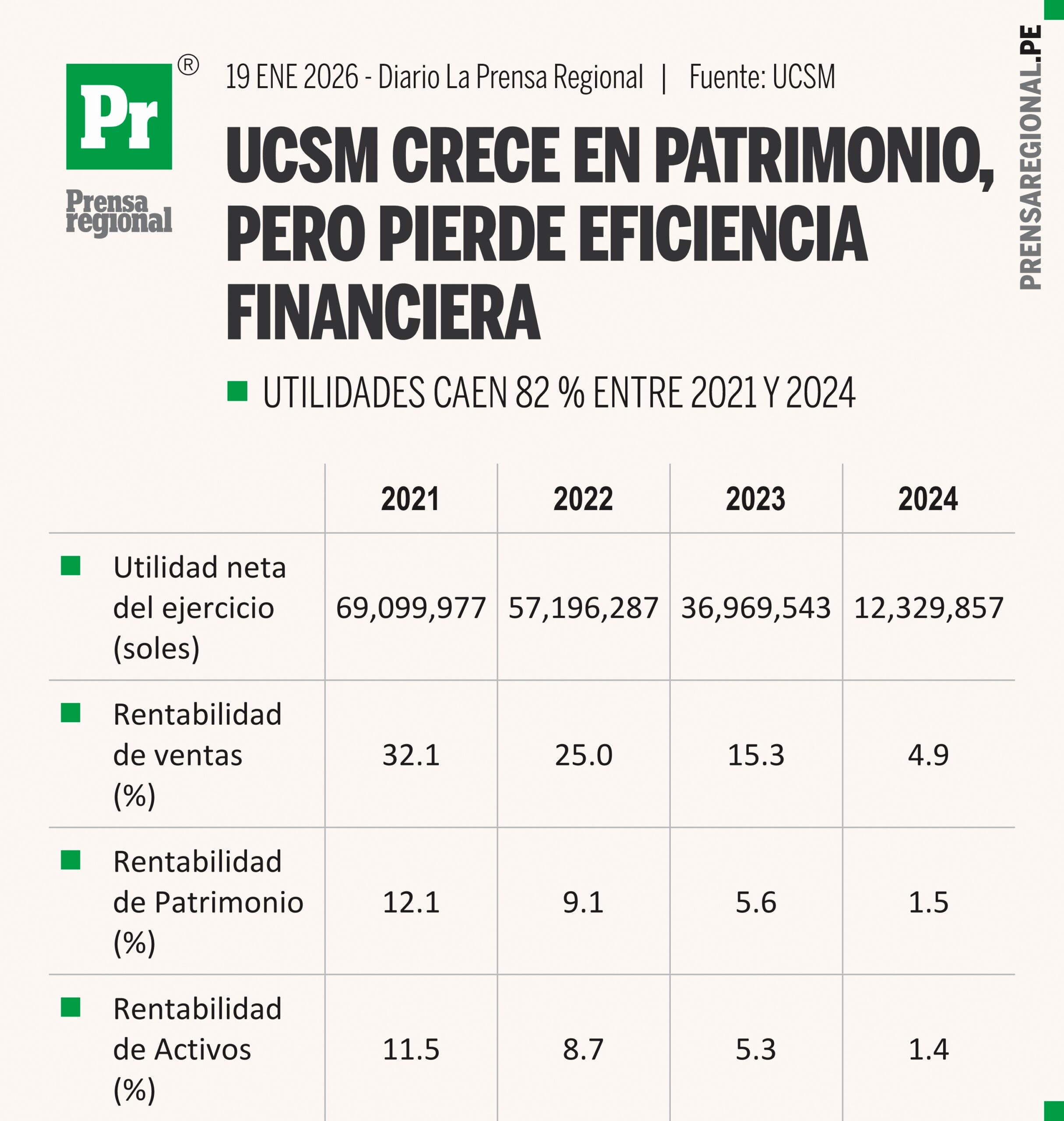 El análisis de los estados financieros de la Universidad Católica de Santa María (UCSM), evidencia un contraste significativo entre el crecimiento de su tamaño patrimonial y el deterioro sostenido de su rentabilidad, revelando problemas de eficiencia económica y uso de recursos.