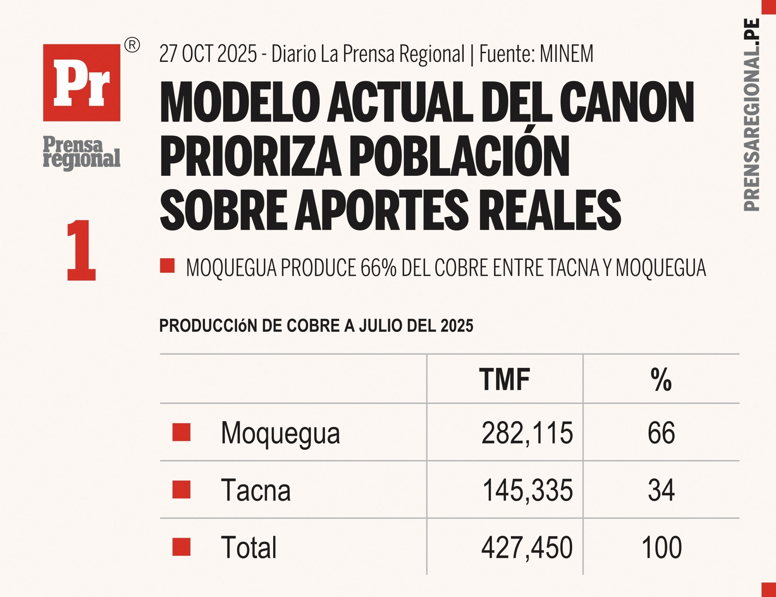 Urge una reforma integral que restablezca la relación entre producción, aporte fiscal y compensación territorial, de modo que regiones como Moquegua, que generan riqueza y asumen pasivos ambientales, reciban lo que justamente les corresponde.