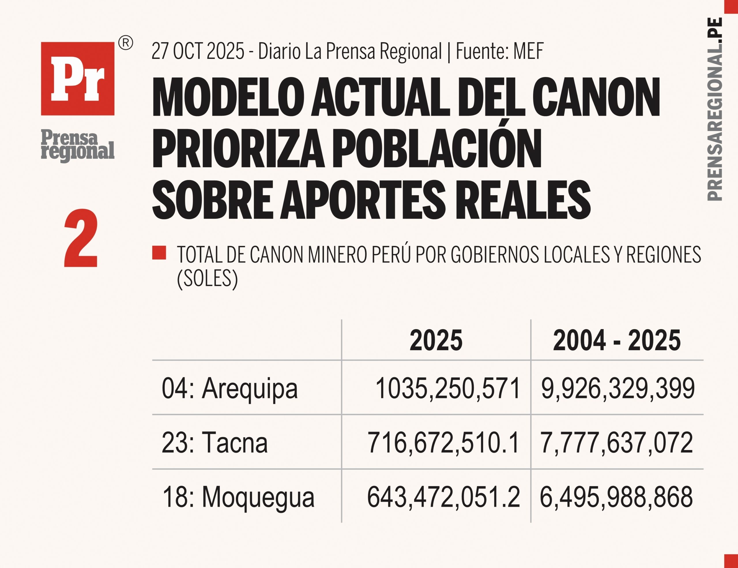 Entre 2004 y 2025, el acumulado muestra que Arequipa ha recibido S/ 9,926 millones, Tacna S/ 7,777 millones y Moquegua S/ 6,495 millones, a pesar de su altísima productividad minera.