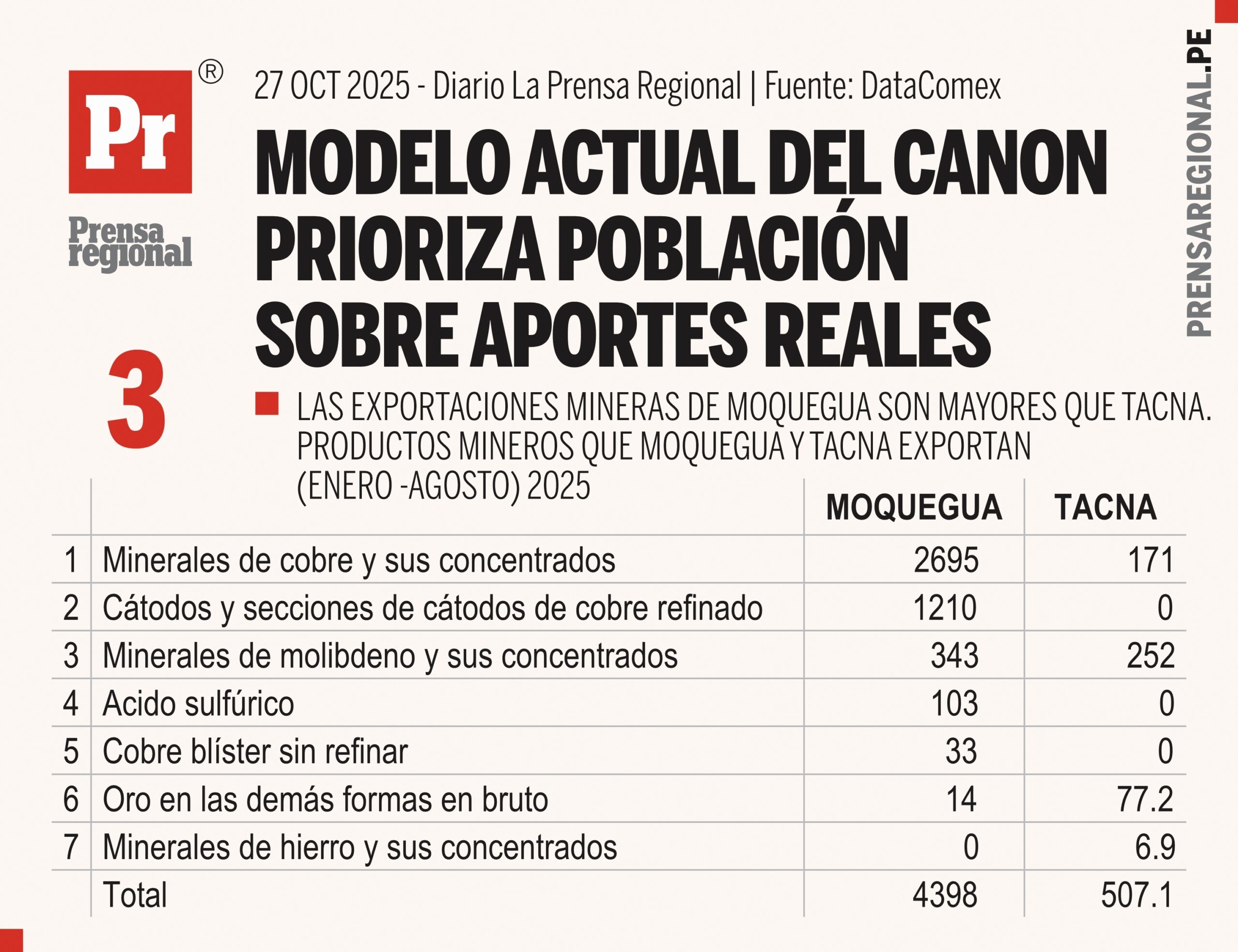 En exportaciones, la diferencia es aún mayor: Moquegua registró US$ 4,398 millones, mientras Tacna apenas US$ 507 millones, según DataComex. Es decir, Moquegua produce y exporta mucho más, fortaleciendo la balanza comercial nacional y la recaudación fiscal.