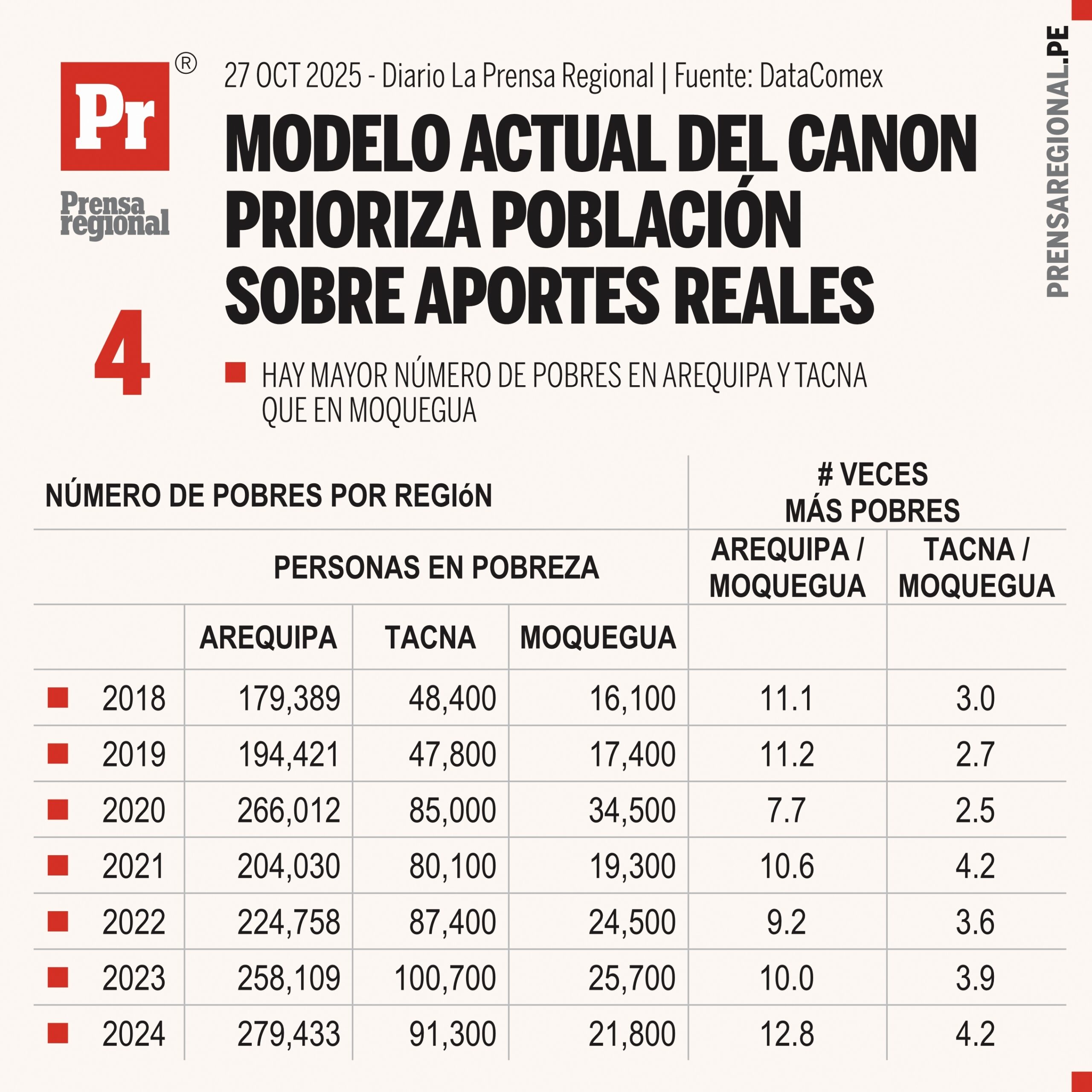 En 2024, Moquegua registró solo 21,800 personas en pobreza, frente a 279,433 en Arequipa y 91,300 en Tacna. En otras palabras, Arequipa tiene 12.8 veces más pobres que Moquegua, y Tacna 4.2 veces más.