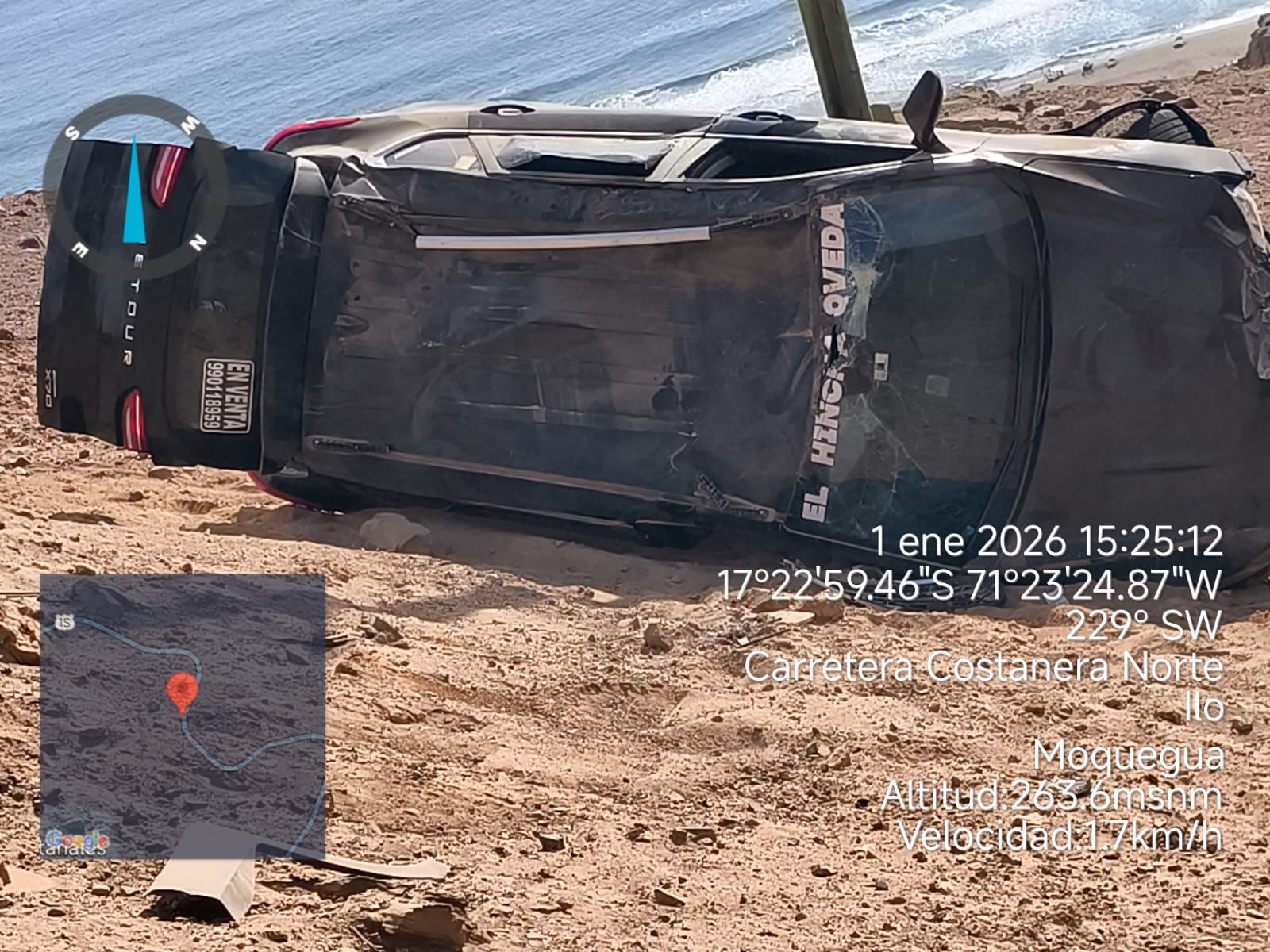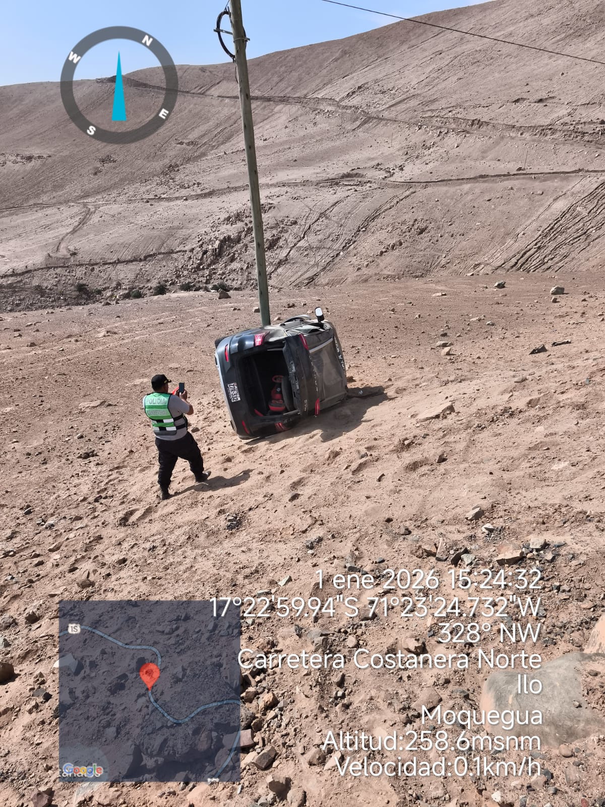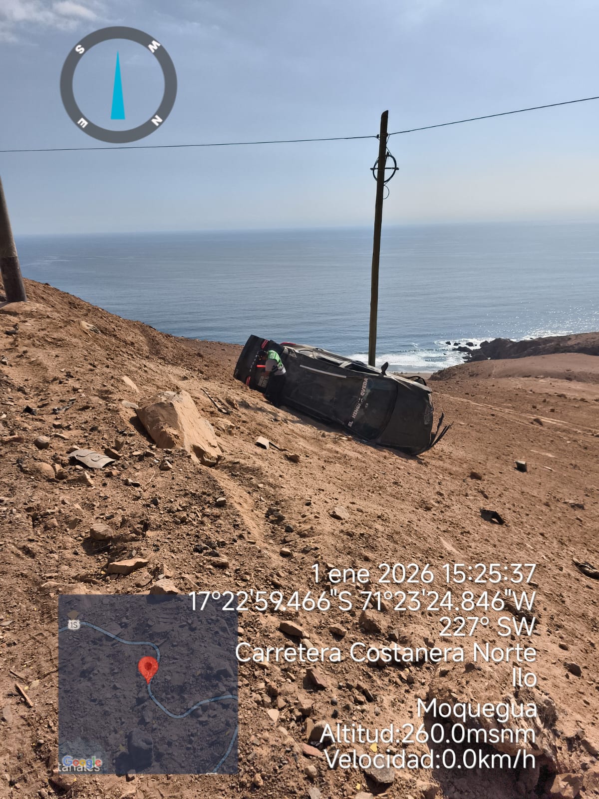 Un accidente de tránsito por despiste y volcadura se registró la tarde de ese 1 de enero de 2026, alrededor de las 14:20 horas, en el kilómetro 205+200 de la carretera Costanera Norte de Ilo, dejando como saldo varias personas lesionadas y daños materiales de consideración.